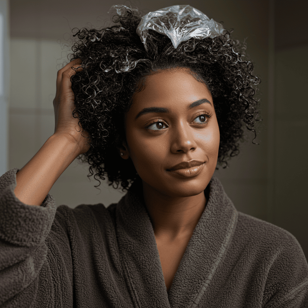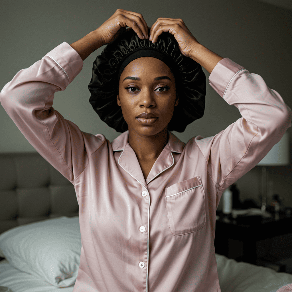 Nighttime routine for preserving 4A curls, demonstrating the pineapple method with satin protection.