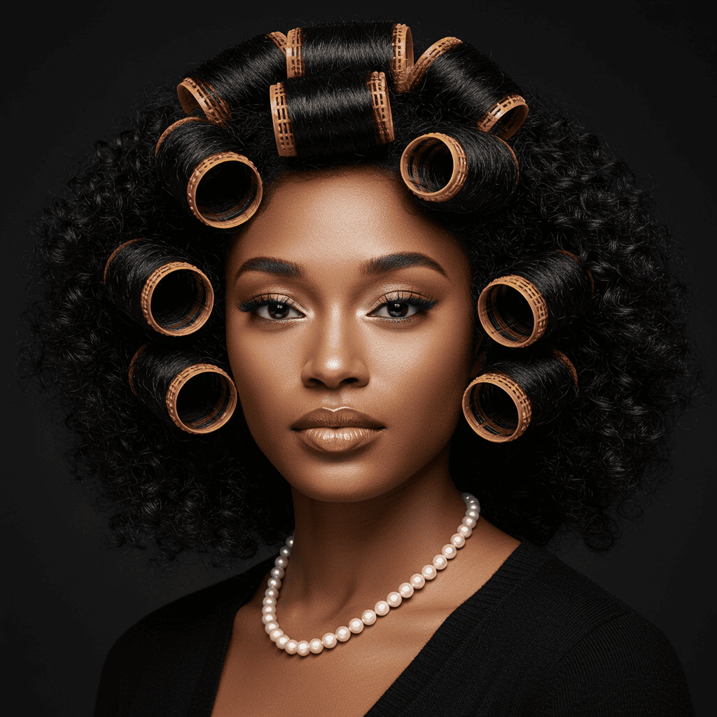 Classic roller set on 4B hair creating smooth, stretched style with bouncy curls at ends - a heat-free stretching method.