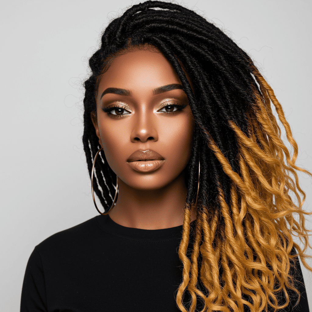 Ombre faux locs transitioning from black to honey blonde, adding dimension to this protective style.