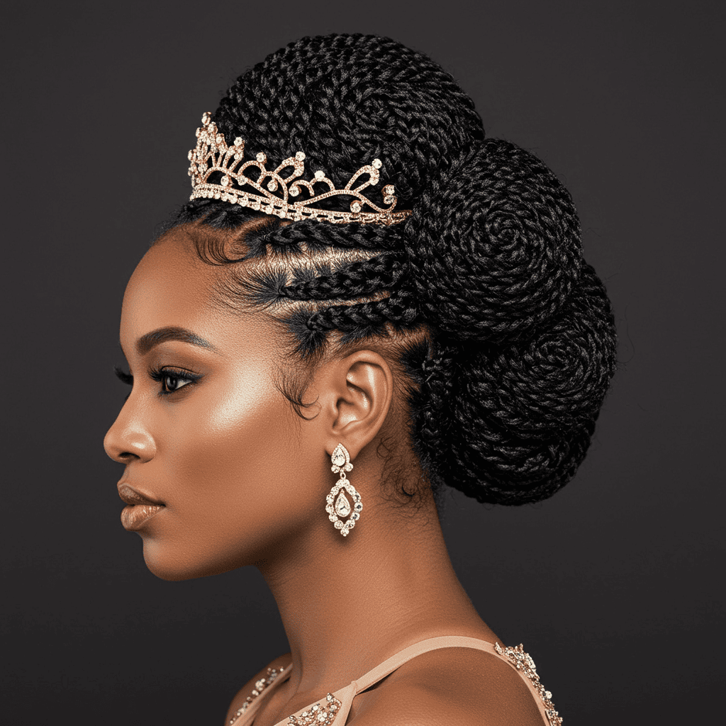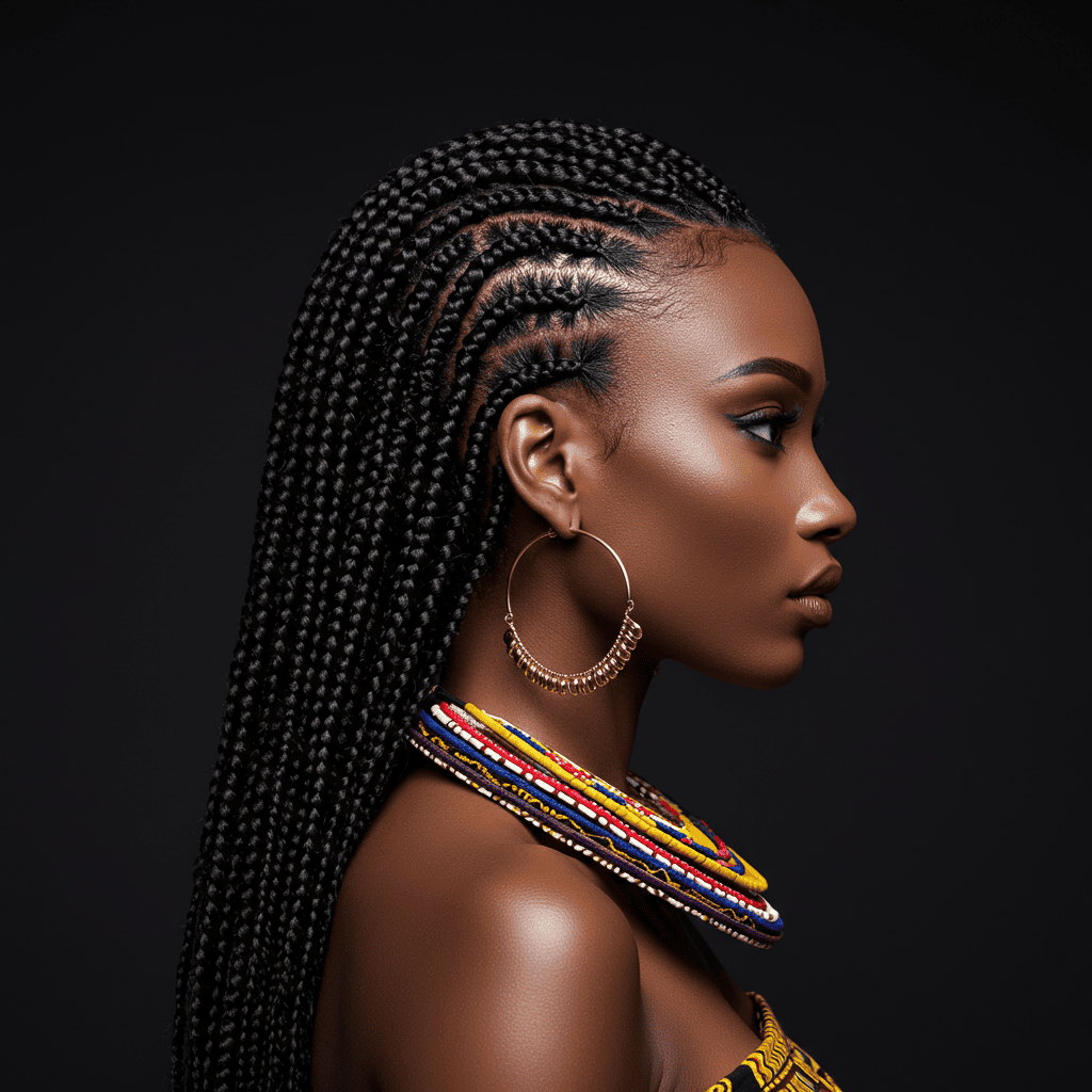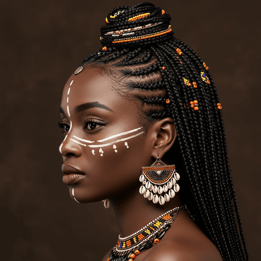 Traditional Fulani braids adorned with beads and shells, honoring West African braiding traditions and cultural heritage.