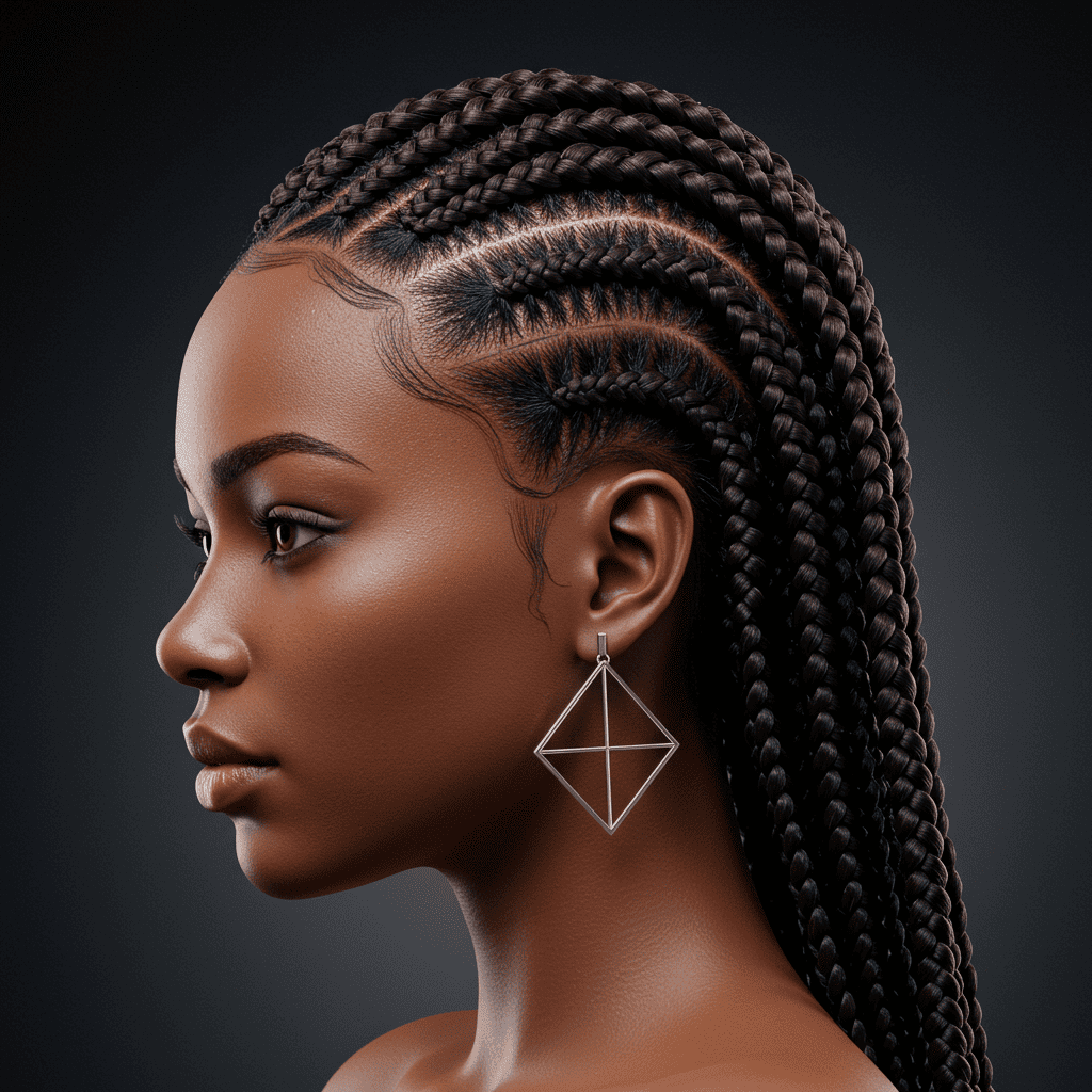 Artistic cornrow design demonstrating the versatility of protective braiding with complex geometric patterns.