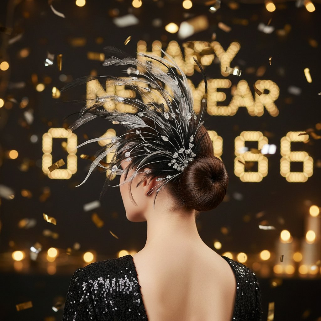 A sleek bun accented with a dramatic feathered hairpiece, combining elegance with a touch of whimsy for the New Year.