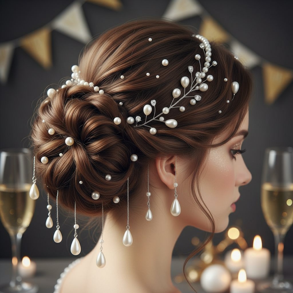An elegant updo embellished with pearls offers a classic look that pairs perfectly with New Year's Eve elegance.
