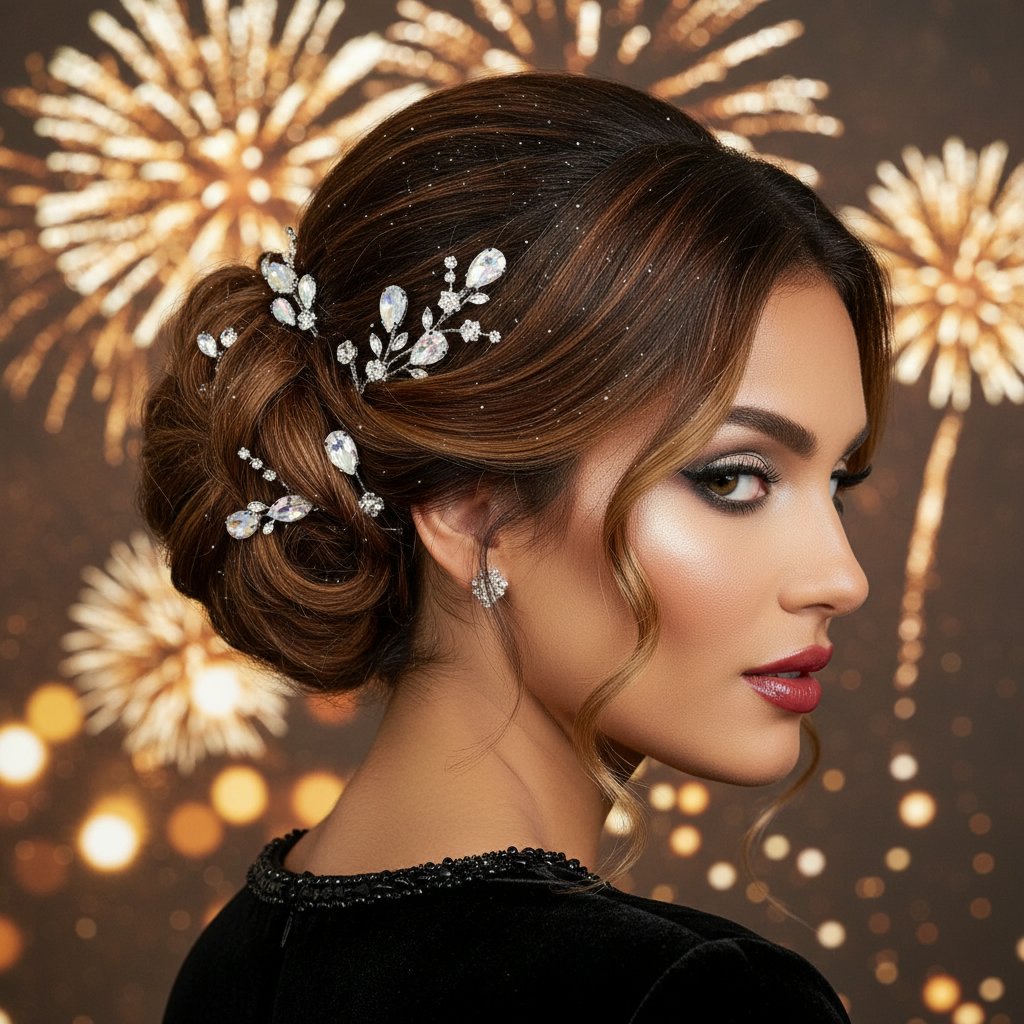 A chic chignon adorned with sparkling hair clips, for a refined and glamorous New Year's hairstyle.