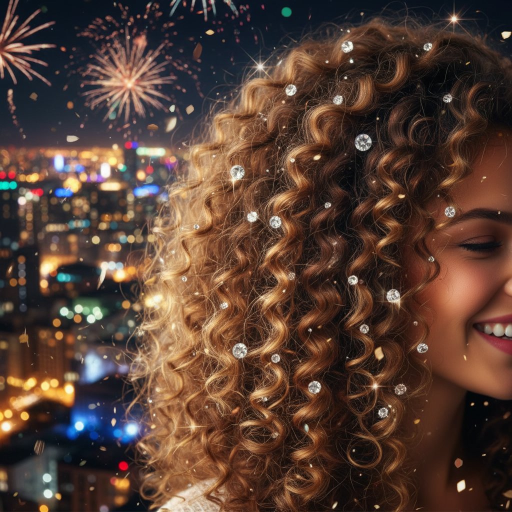 Luscious curls accented with crystal embellishments catch the light and eyes, ideal for New Year's celebrations.