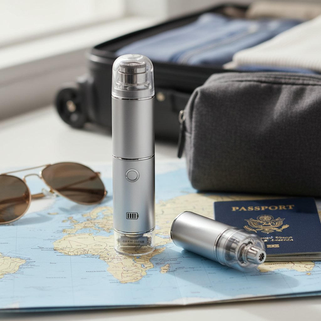 Featuring a compact, battery-operated nose hair trimmer, ideal for on-the-go grooming and travel convenience.