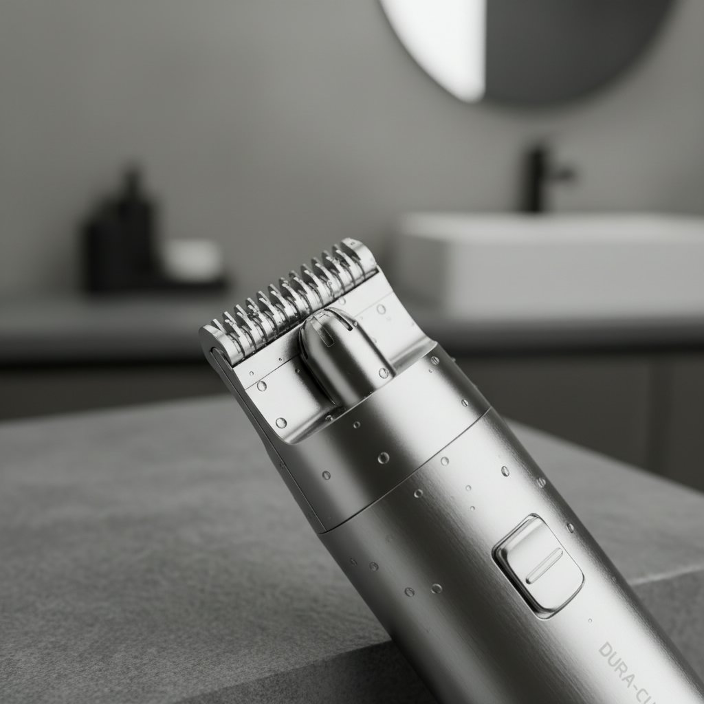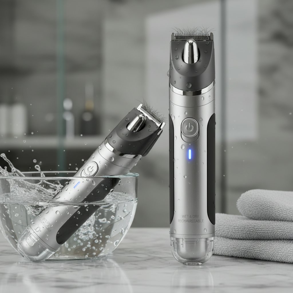 Showcasing a waterproof, rechargeable nose hair trimmer, perfect for use in the shower and easy cleaning.
