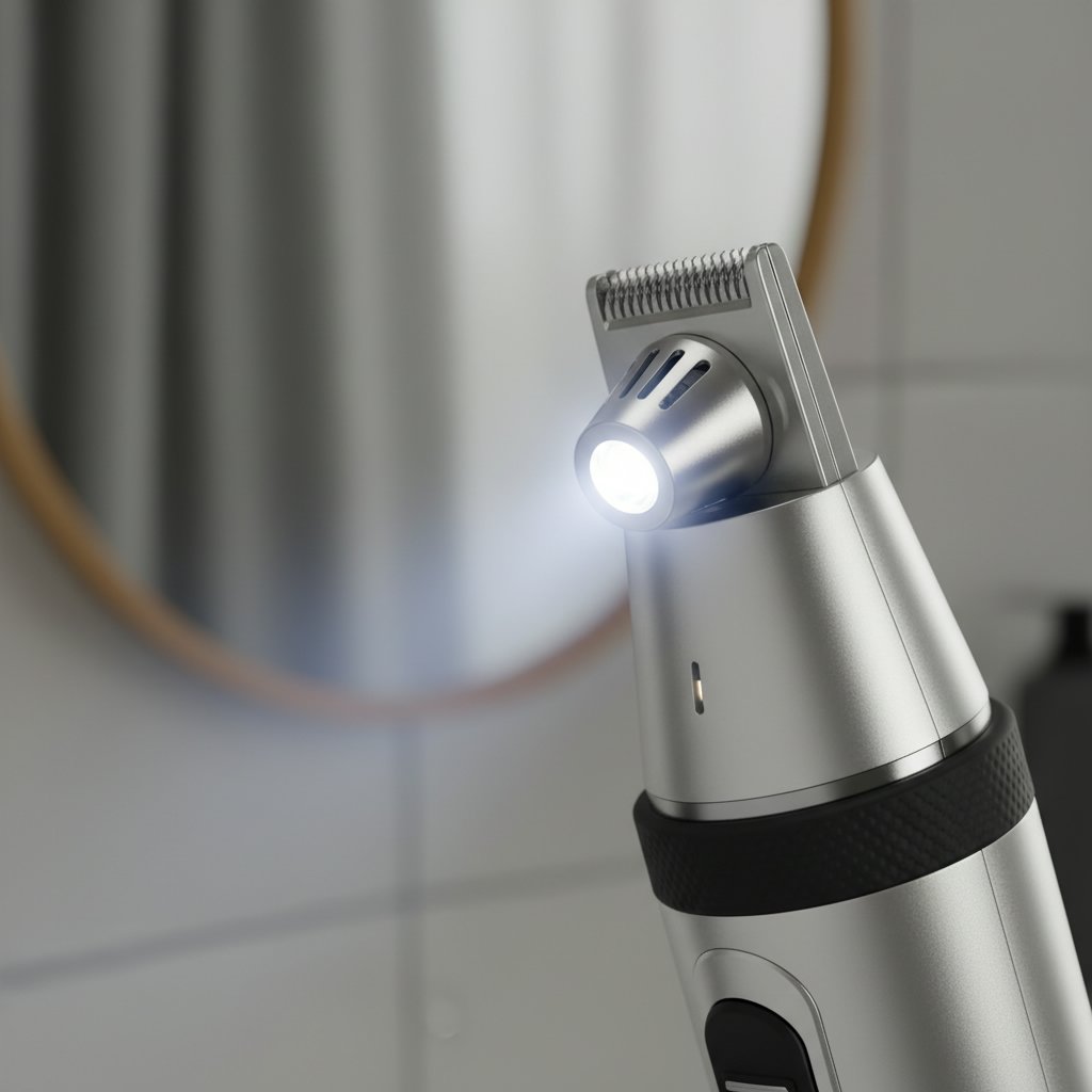 Highlighting a nose hair trimmer with an integrated LED light for precision trimming in low-light conditions.