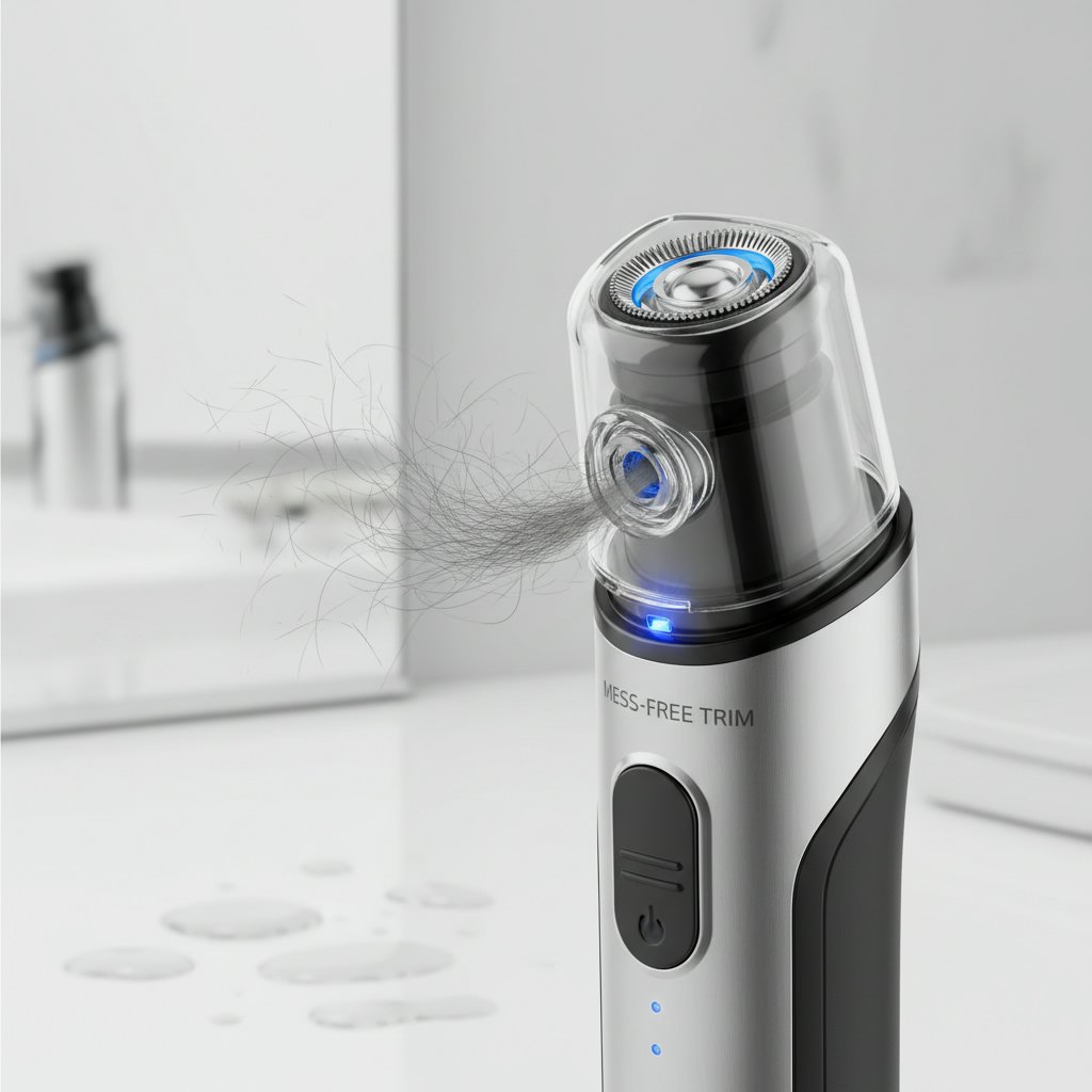 Showcasing a nose hair trimmer with a built-in vacuum system to catch clippings for a clean grooming experience.