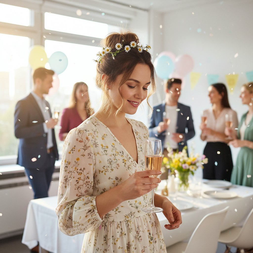 A loose bun, accented with floral pins, offers a whimsical yet professional look, suitable for daytime office celebrations.