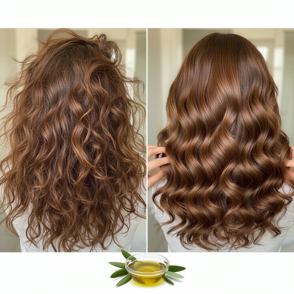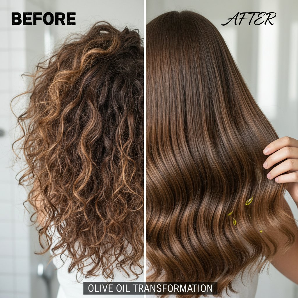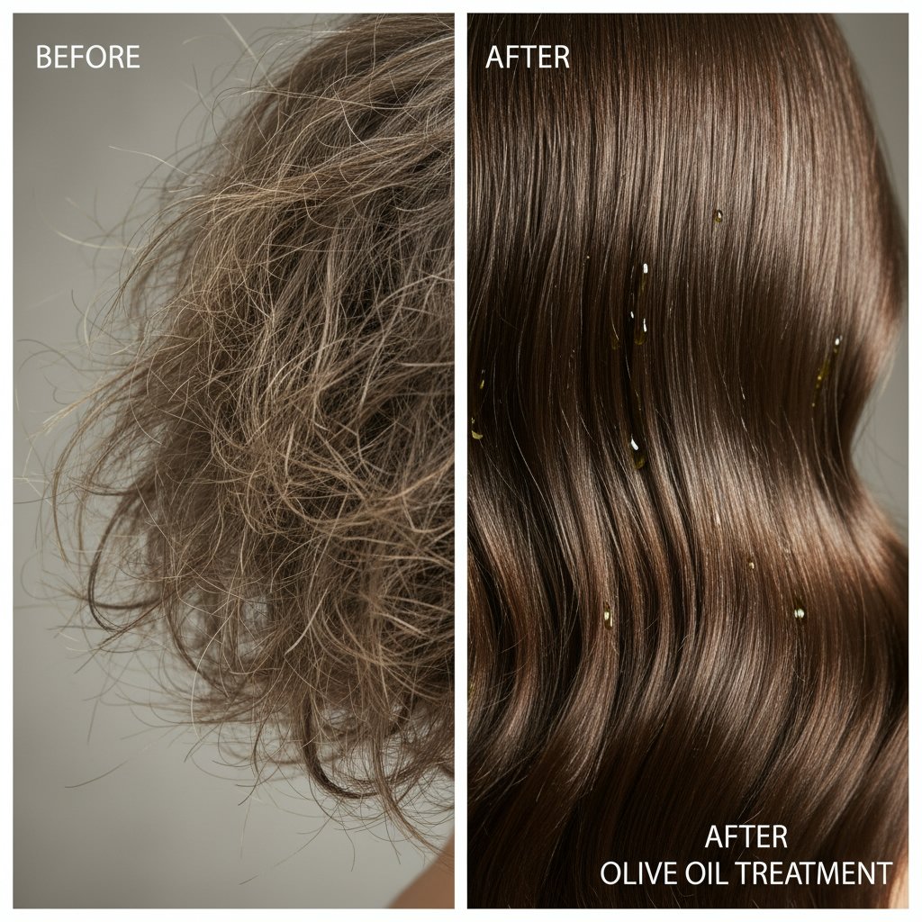 Before: Dull, lifeless hair. After: Restored vibrancy and shine, showcasing olive oil's natural luster-enhancing effects.