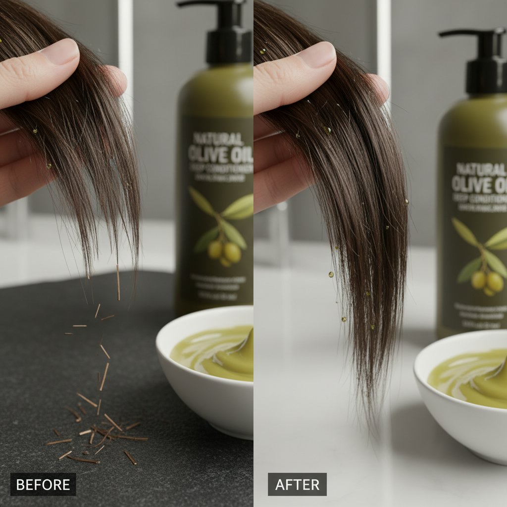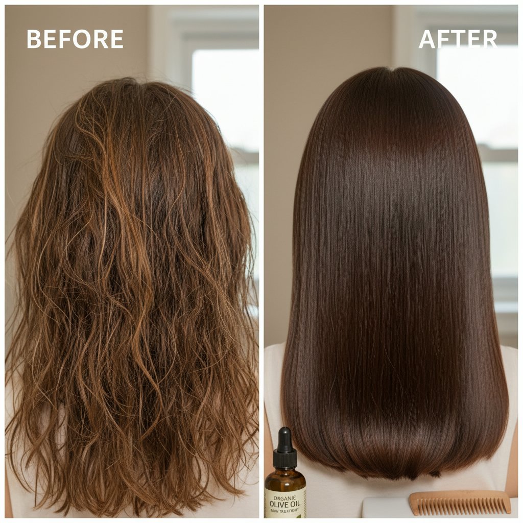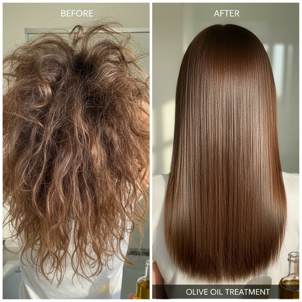 Before: Brittle and dry hair. After: Revitalized strands with a noticeable sheen from olive oil treatments.