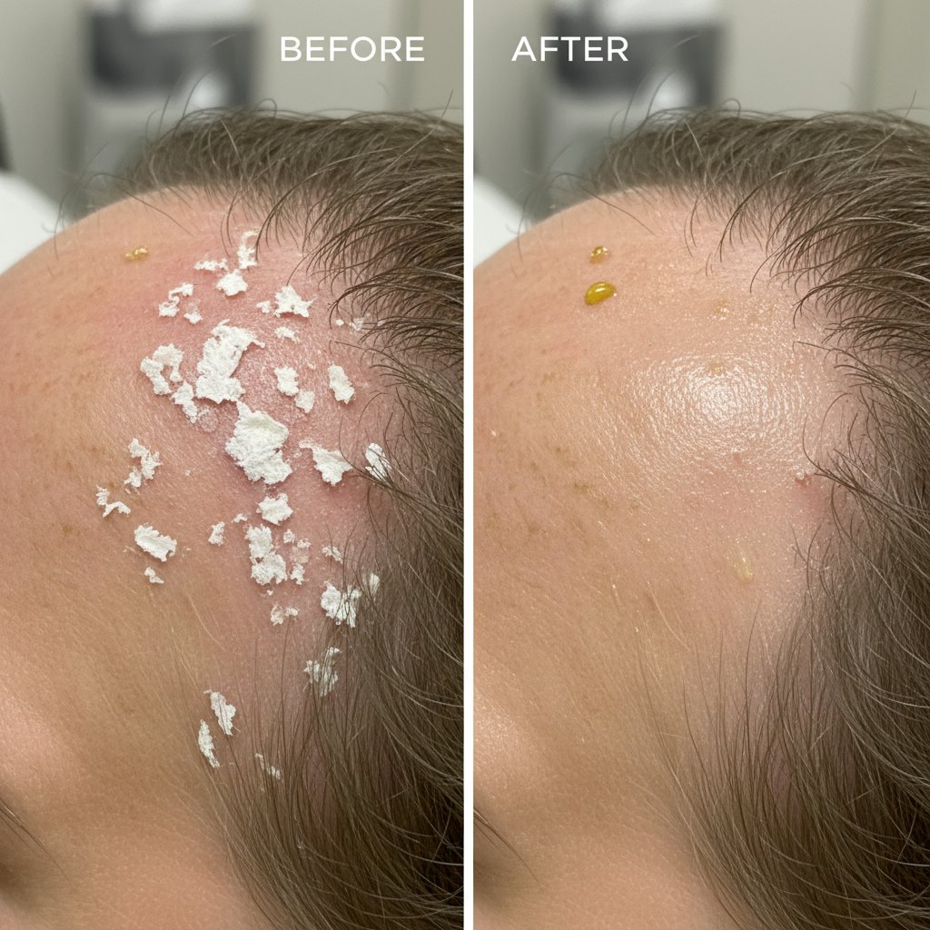 Before: A dry, flaky scalp. After: A deeply moisturized, healthy scalp, alleviating dandruff with olive oil.