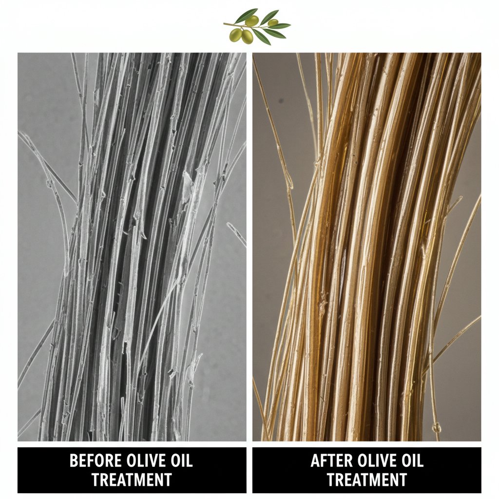 Before: Weak hair fibers prone to damage. After: Stronger, more resilient hair fibers, thanks to olive oil's fortifying properties.