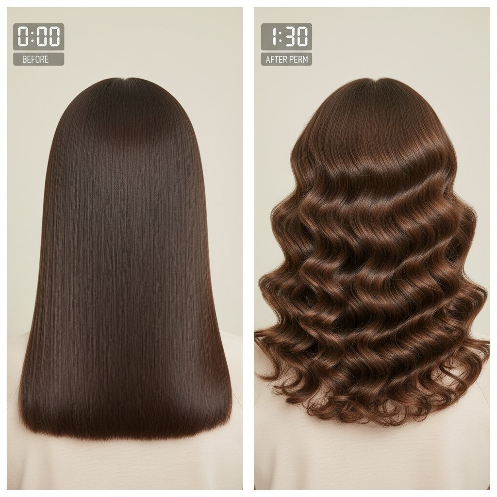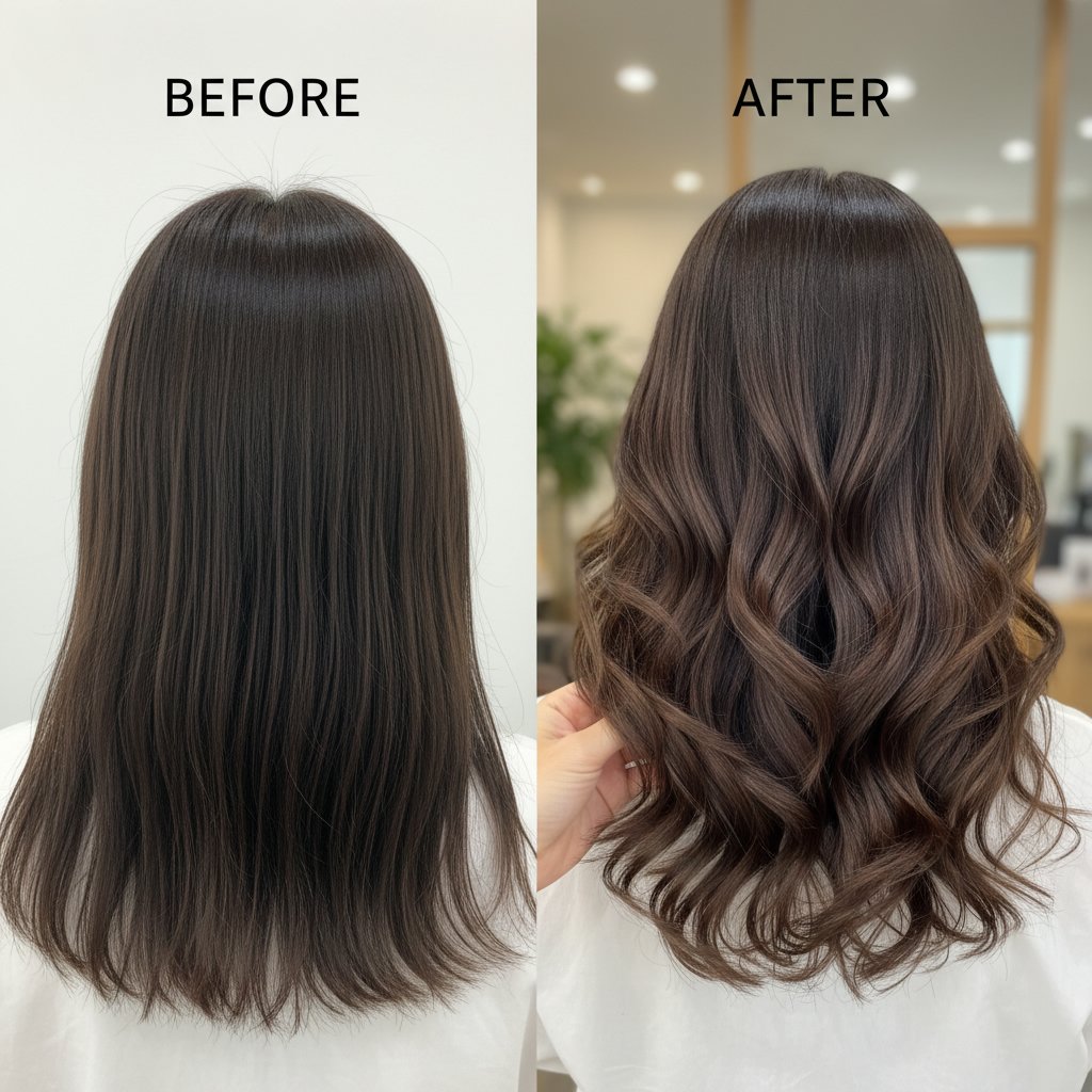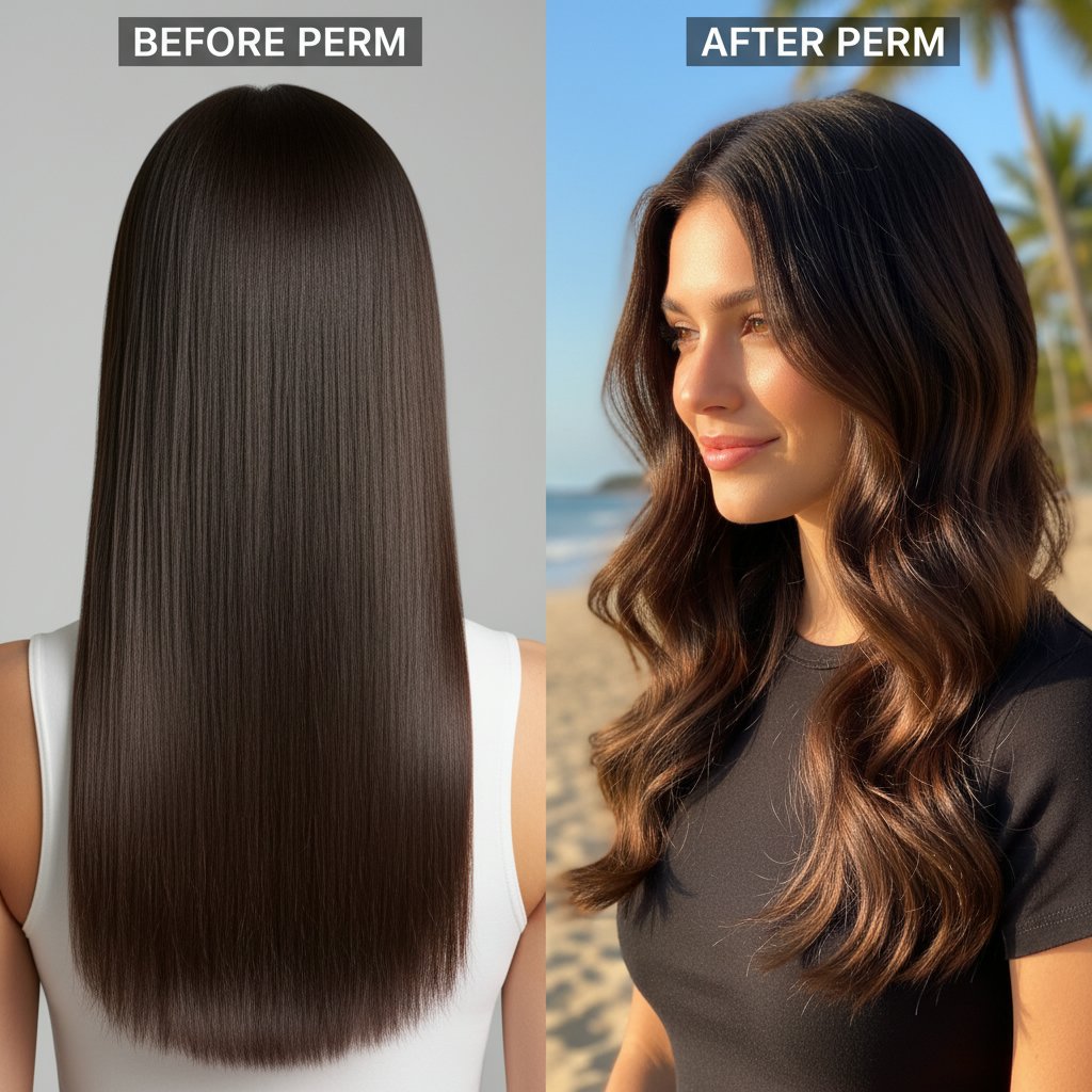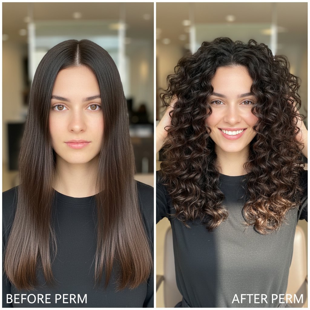 Before: Straight, lifeless hair. After: Soft, natural waves that breathe life into the hair, showcasing the versatility of perm treatments.