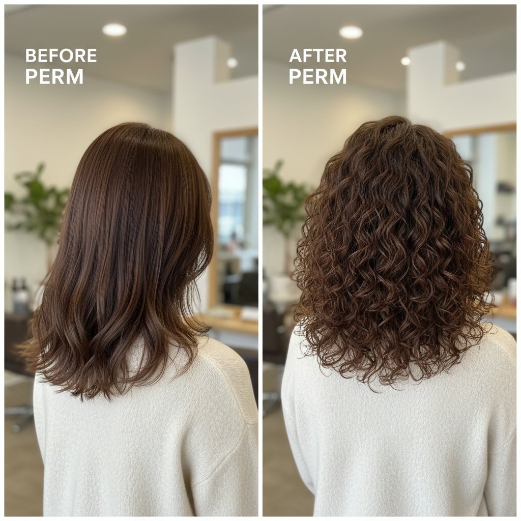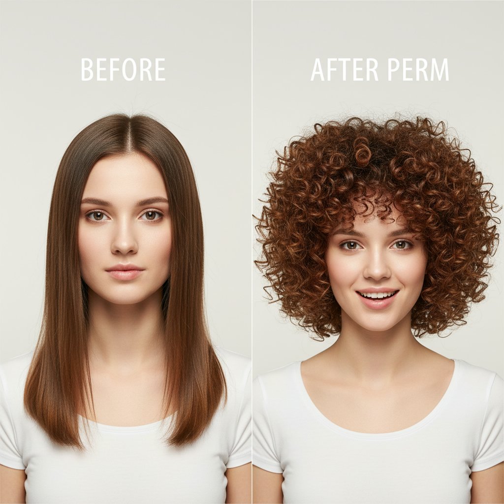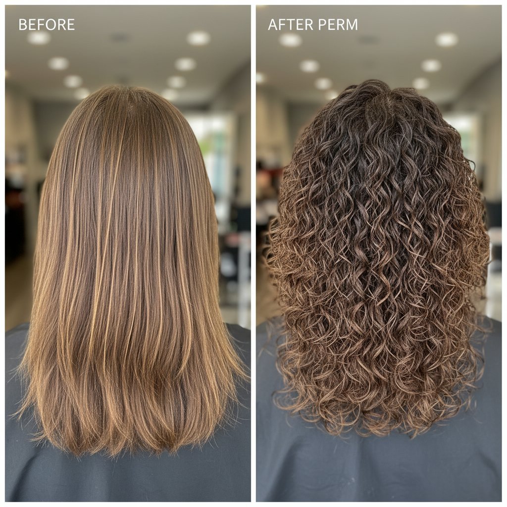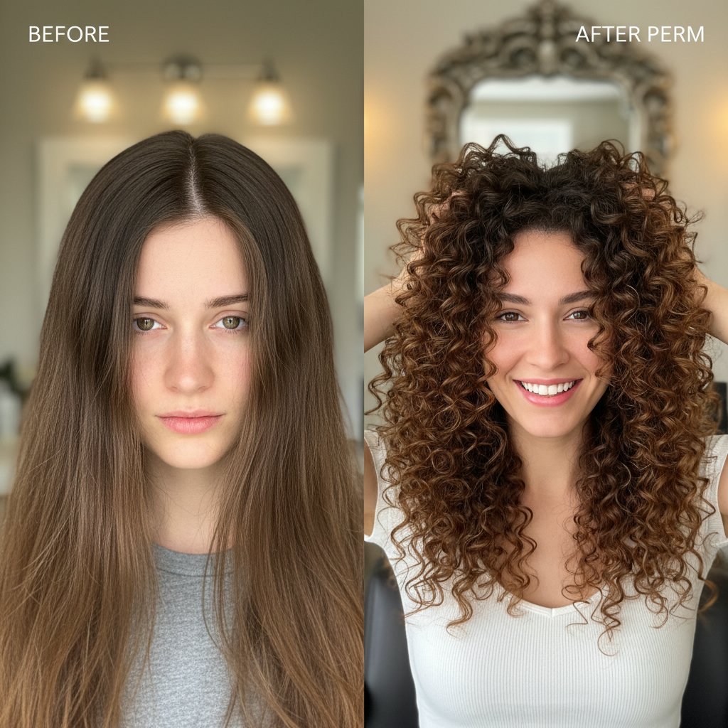 Before: Fine and sparse. After: Thicker-looking locks with curls that provide volume and the illusion of more hair, showcasing the perm's ability to create fullness.