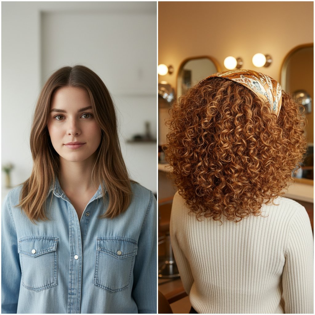 Before: Modern, everyday look. After: A throwback to retro glamour with voluminous, bouncy curls, showcasing the perm's versatility.