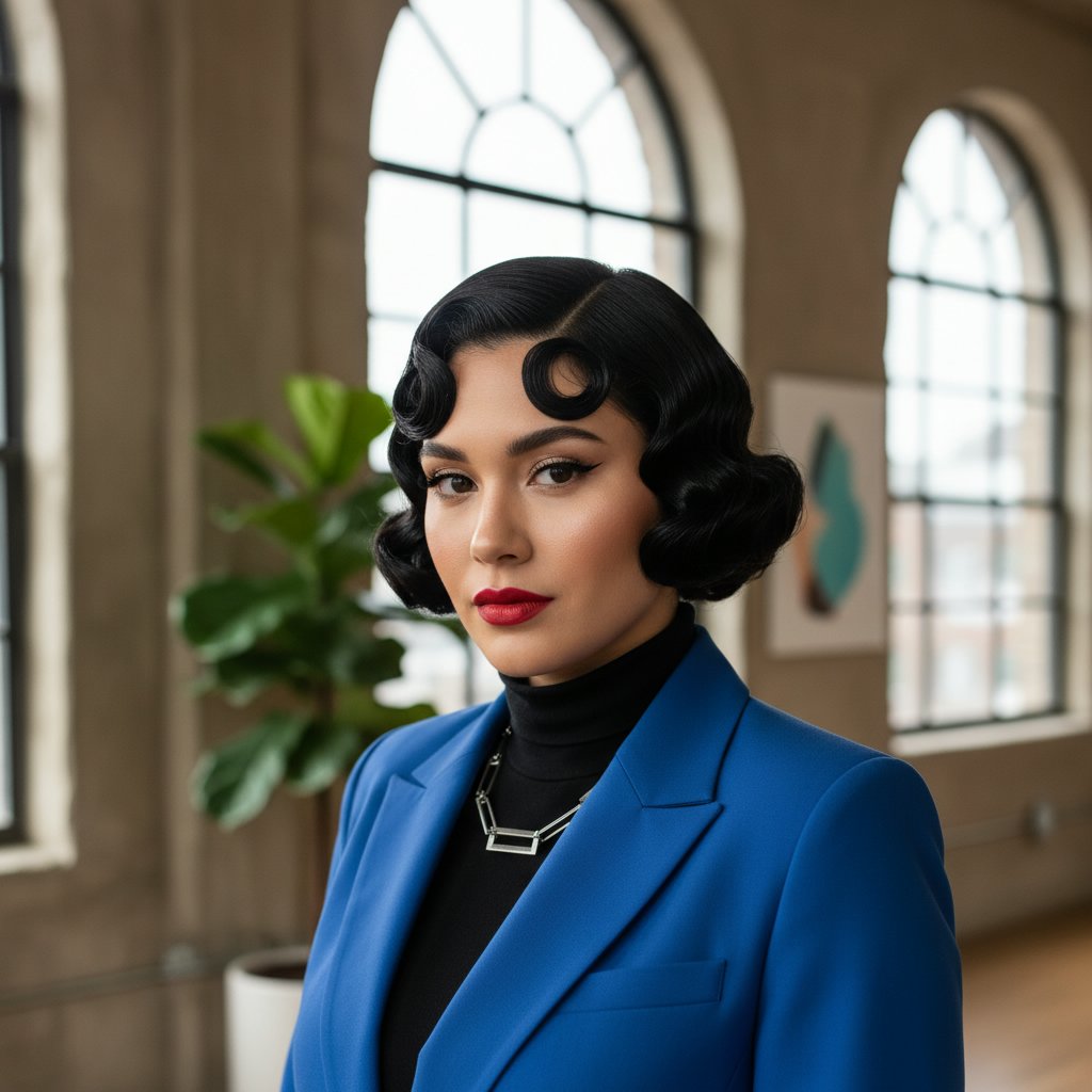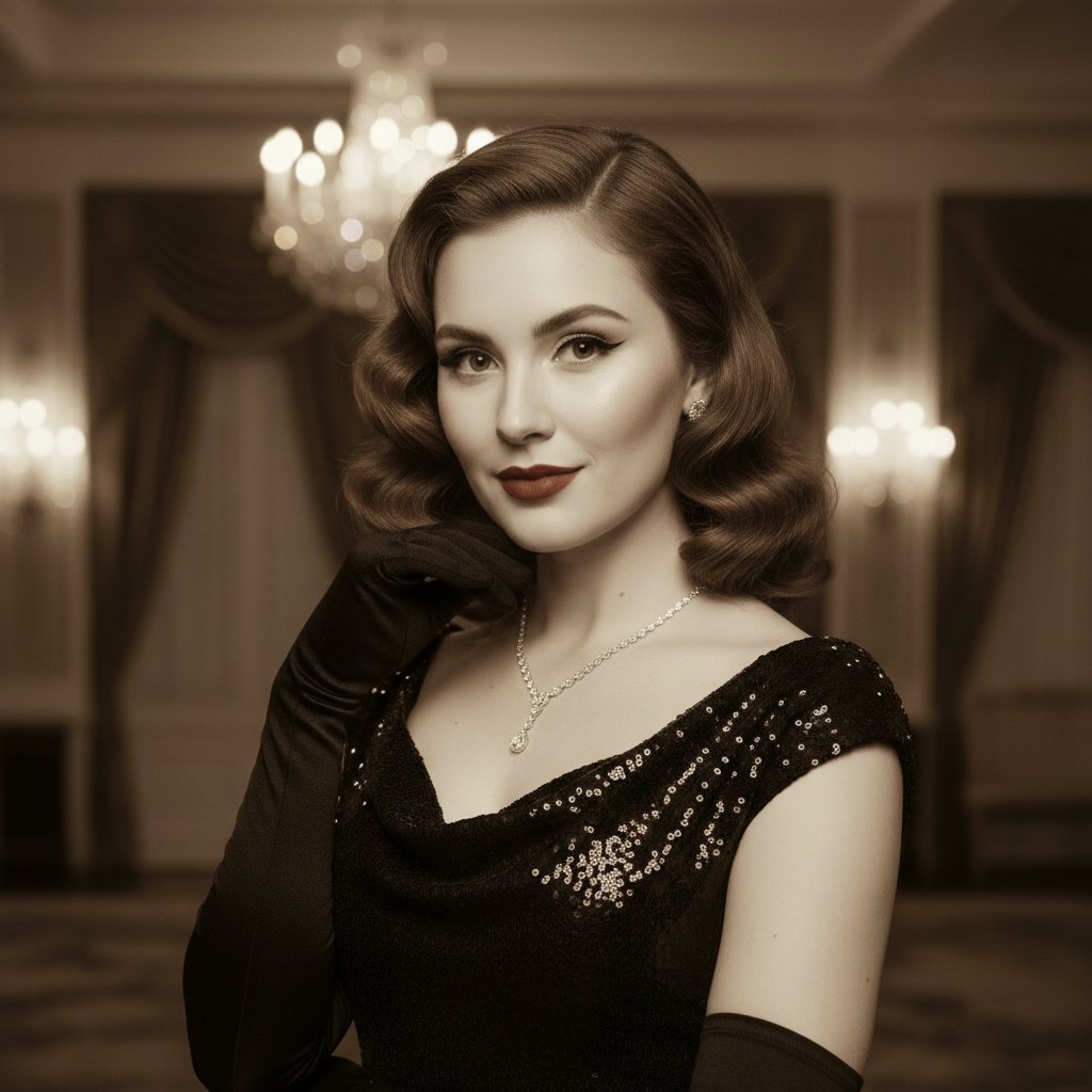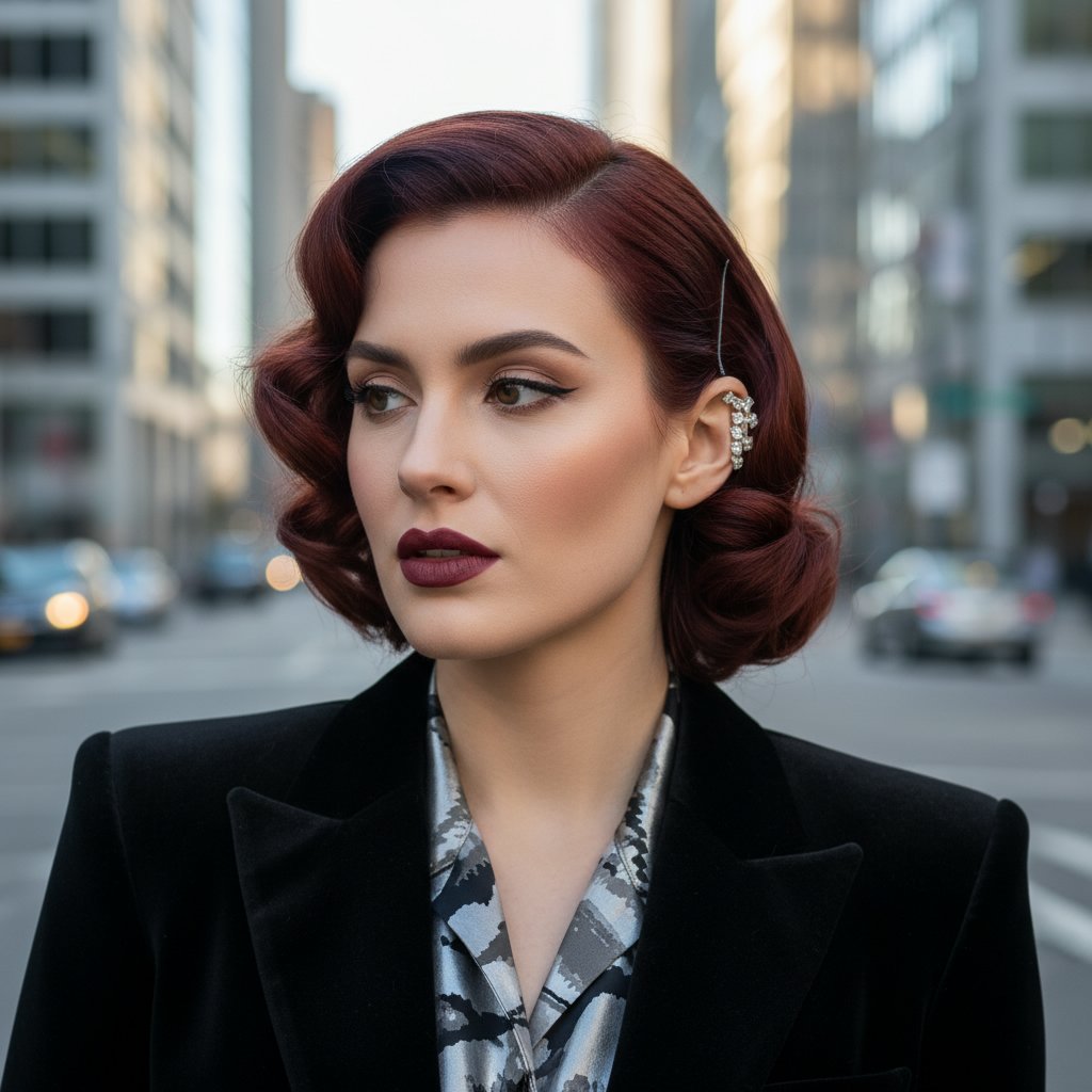 Side-swept pin curls add a modern twist to the vintage style, perfect for a romantic evening or a chic event.
