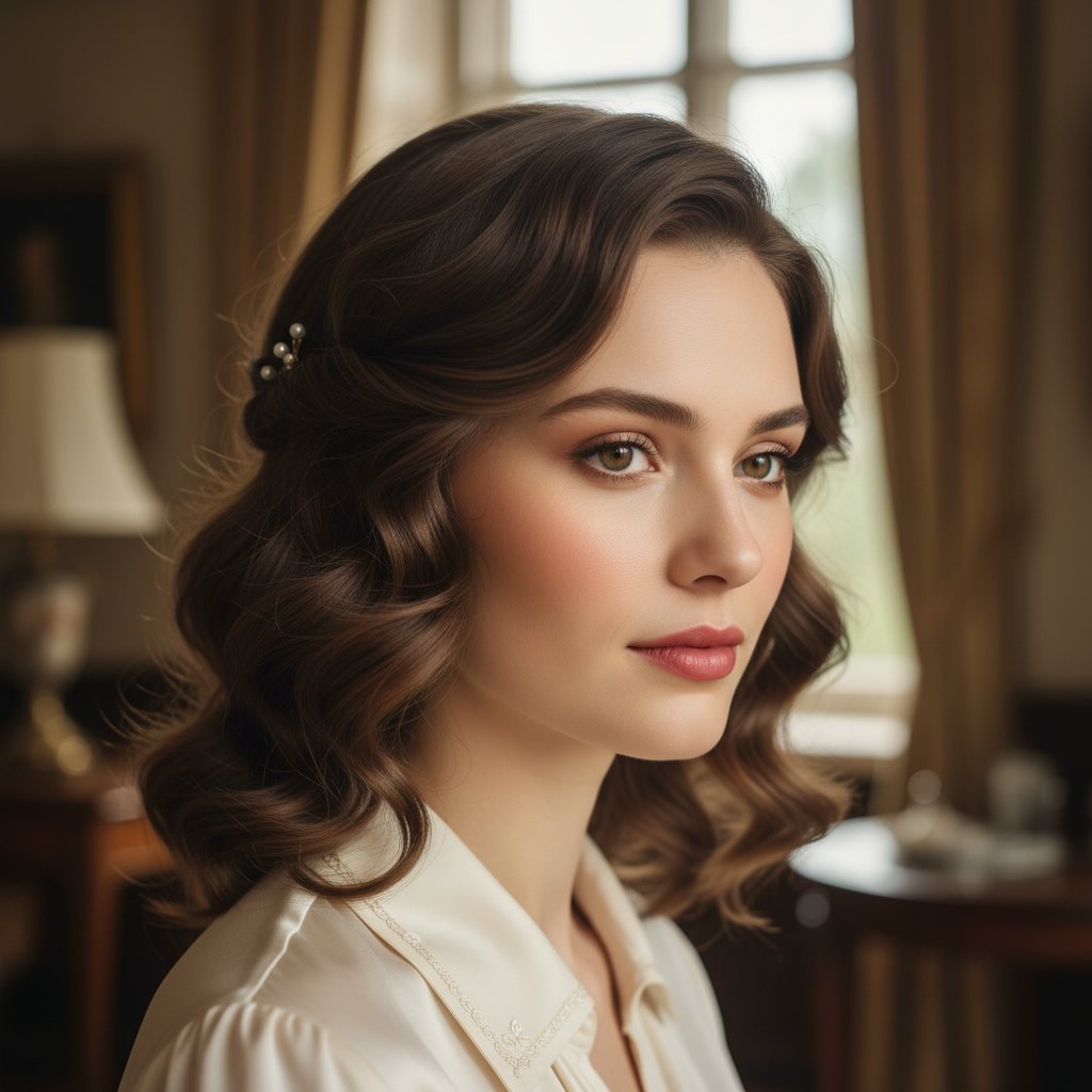 Soft wave pin curls gently frame the face, offering a subtler take on the vintage style for everyday elegance.