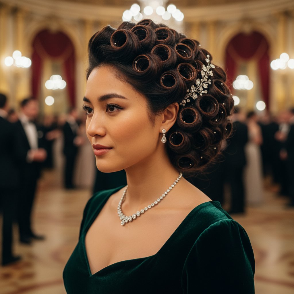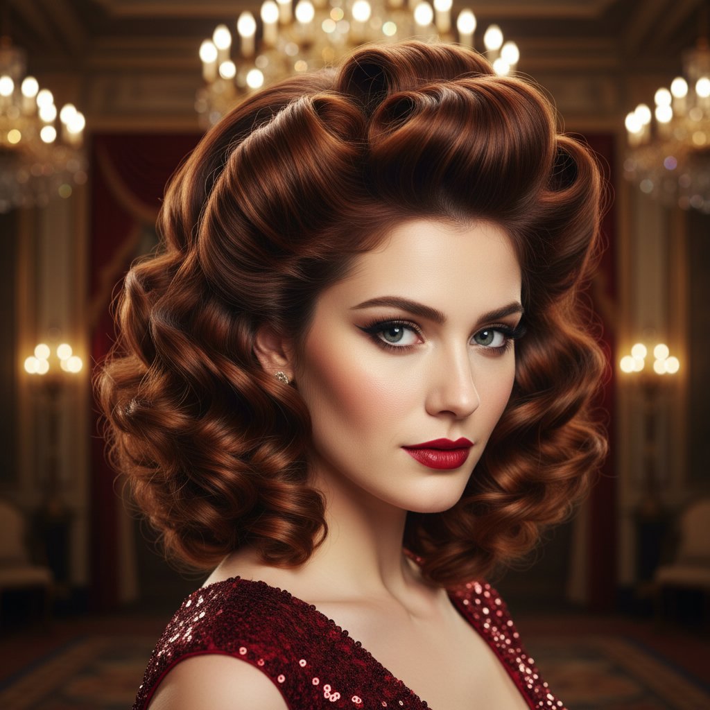 Achieve dramatic volume with pin curls designed to uplift and create a bold statement, reminiscent of the golden age of cinema.