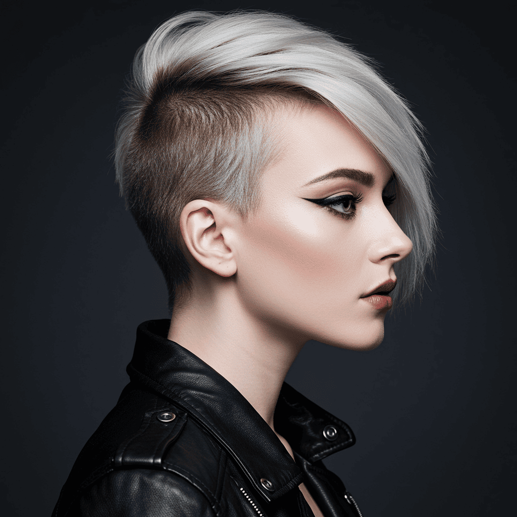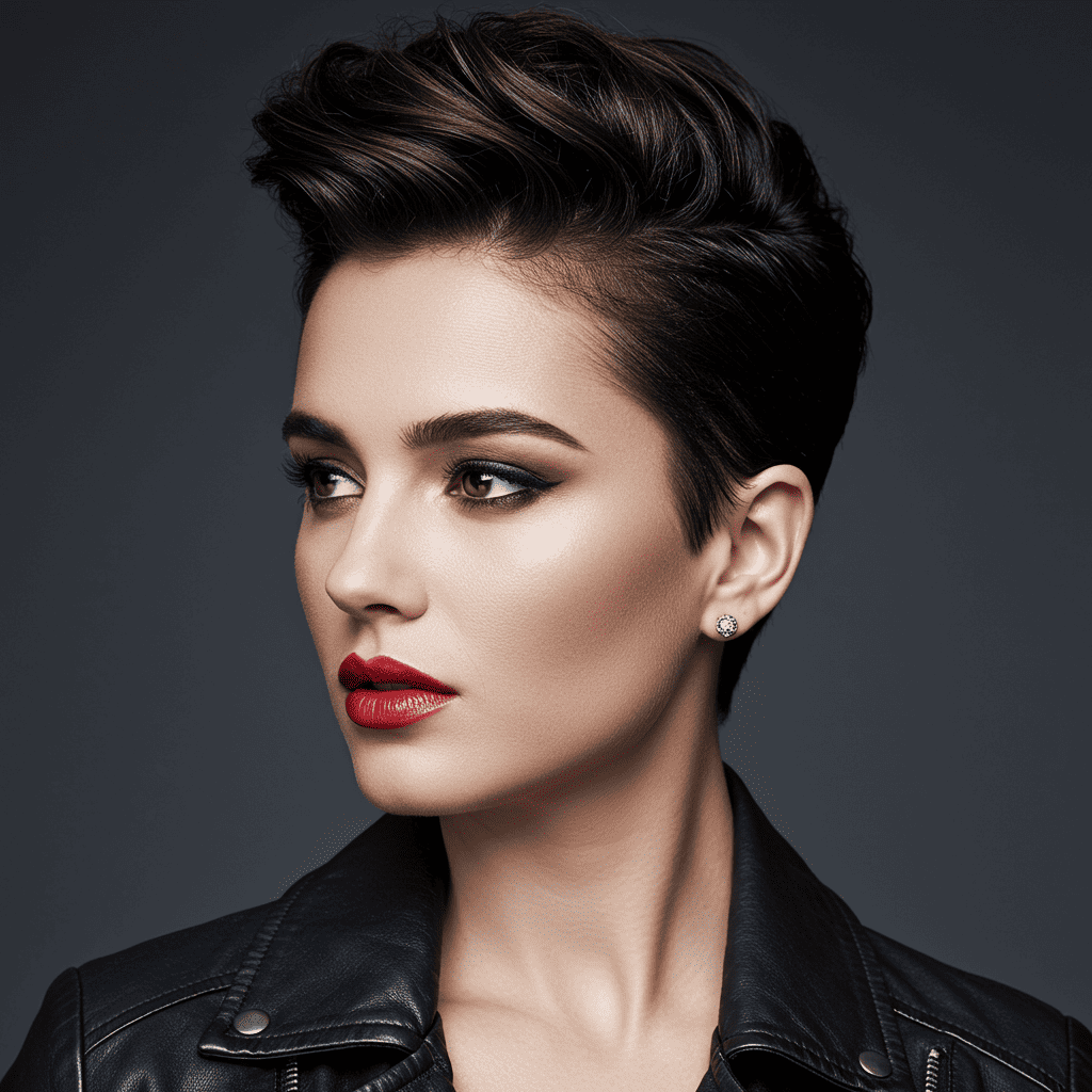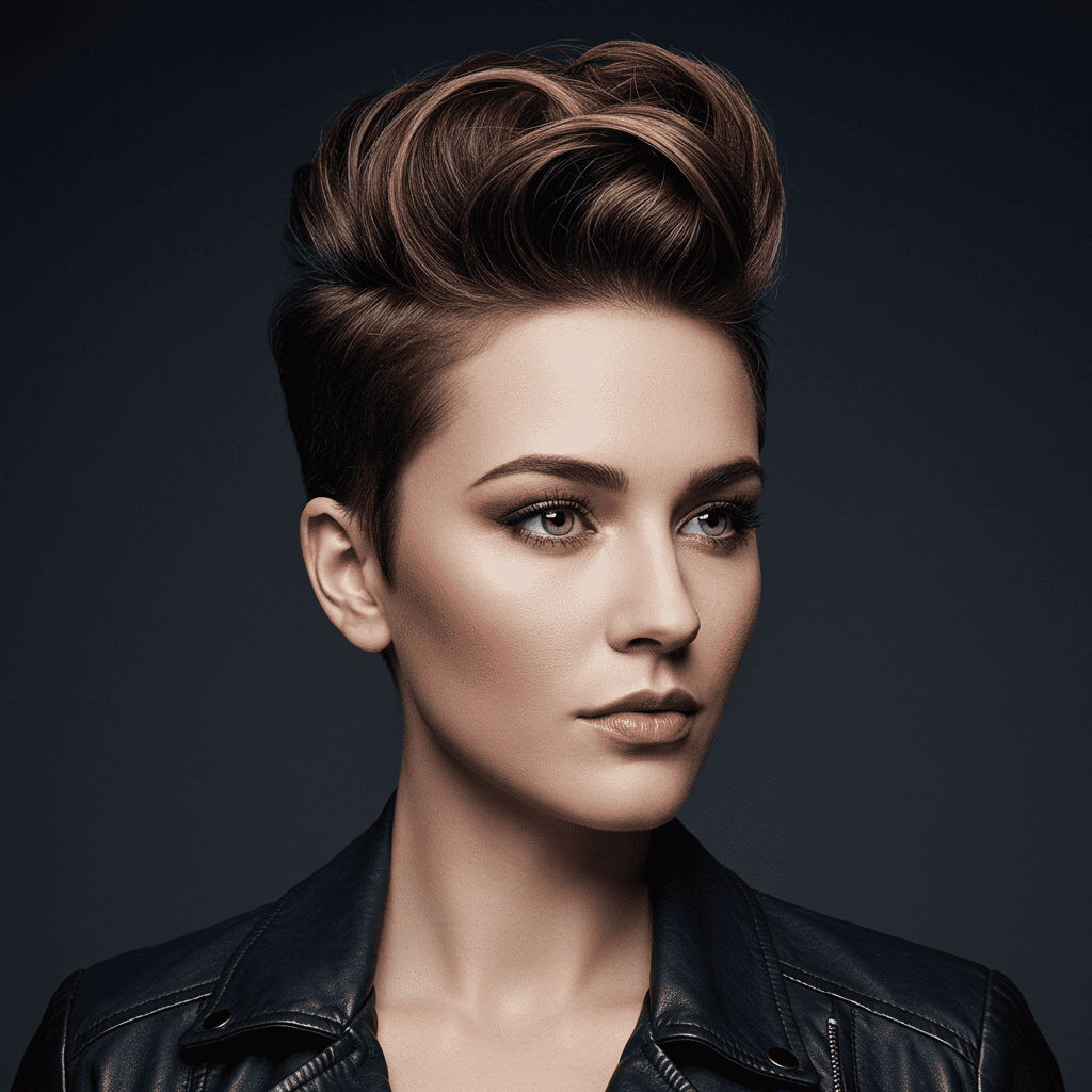 A dramatic pompadour-styled pixie with height and volume on top contrasting with closely cropped sides.
