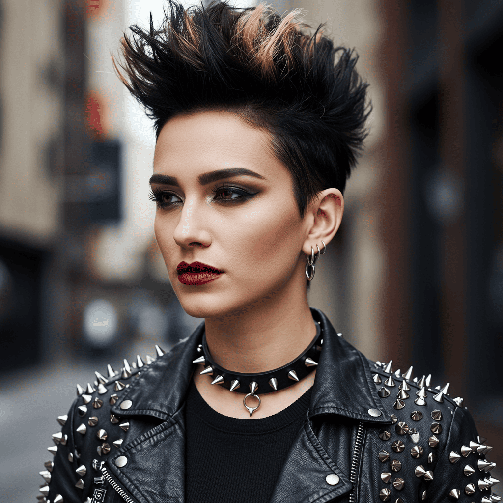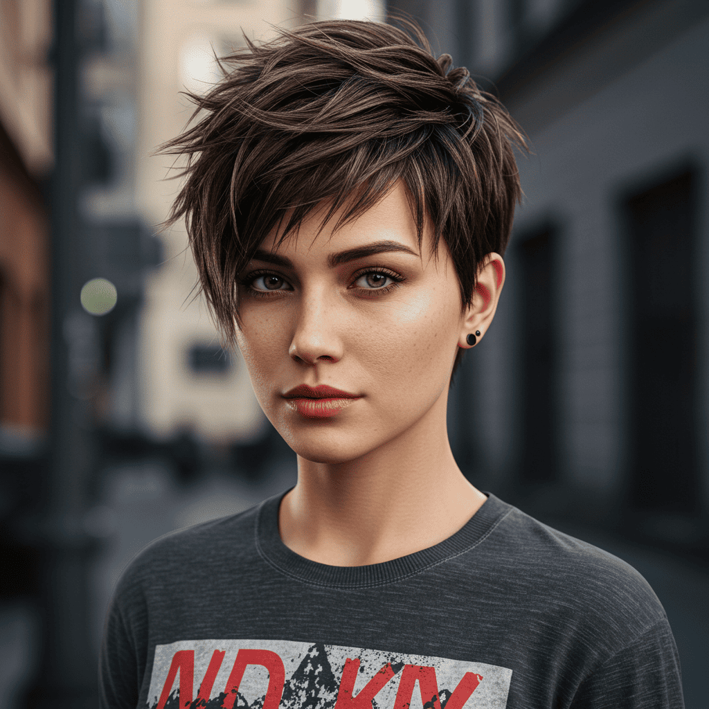 A punk-inspired spiky pixie with pieces styled upward for maximum attitude and edge.