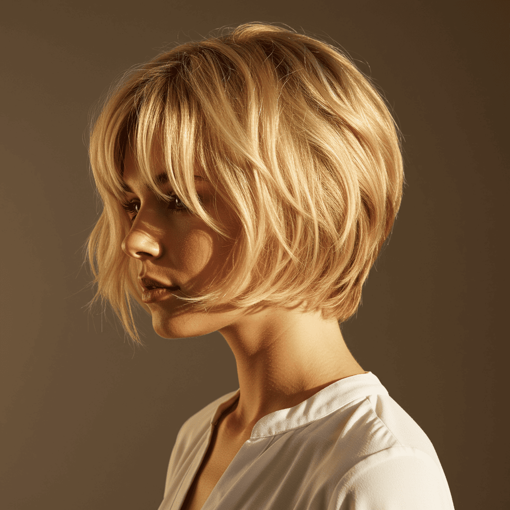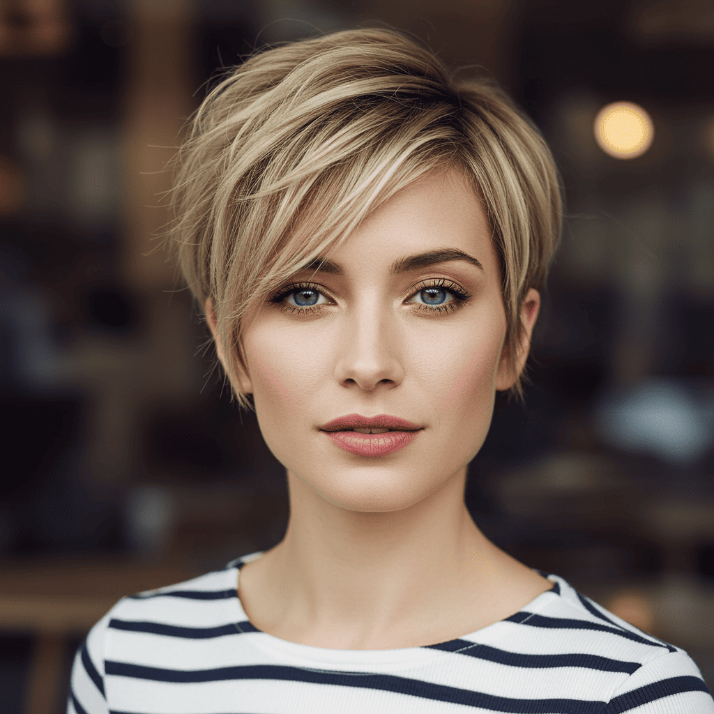 A gentle, feminine pixie in warm blonde tones with soft layers perfect for a romantic aesthetic.