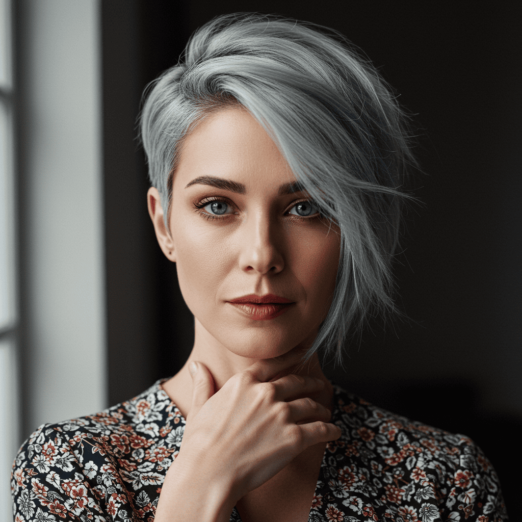 A sophisticated silver pixie that embraces natural gray hair with style and elegance, proving that pixie cuts are ageless and always chic.