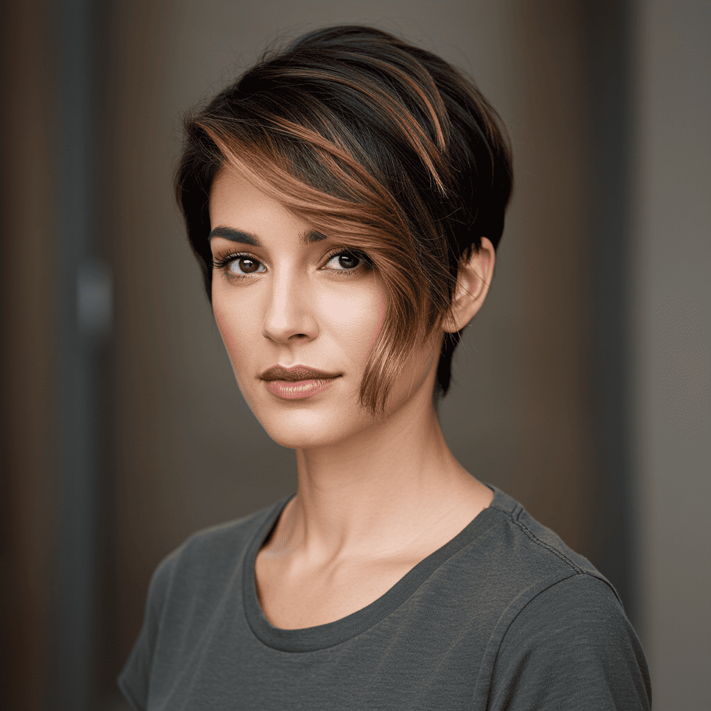 A polished, professional pixie with a deep side part and sleek styling perfect for the boardroom.