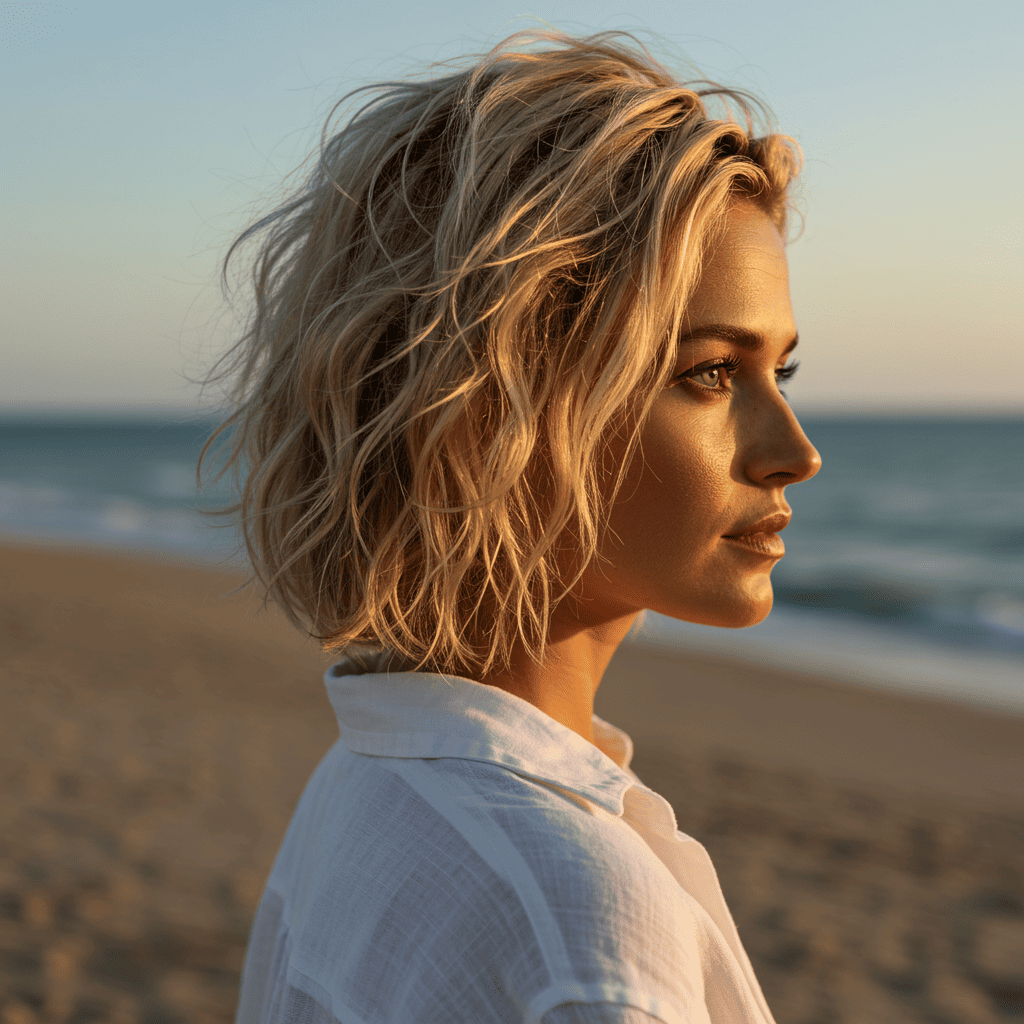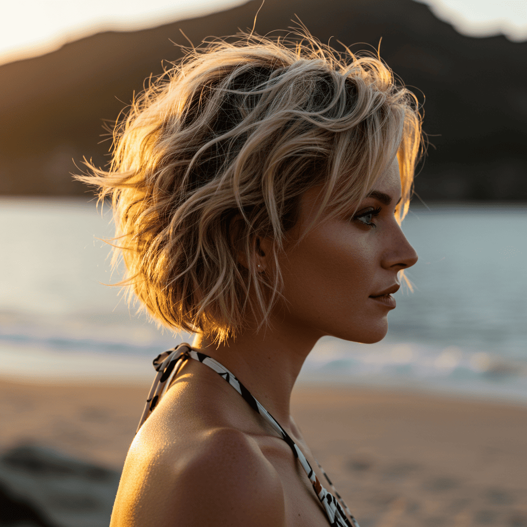 A beachy wavy pixie that embraces natural wave patterns in a shorter length for effortless summer style.