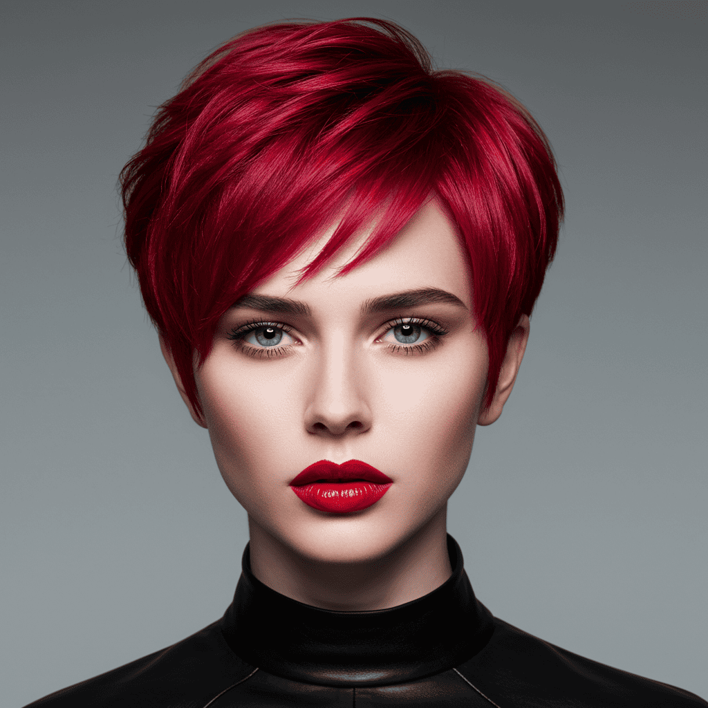 A vibrant cherry red pixie making a bold statement with rich color and textured styling.