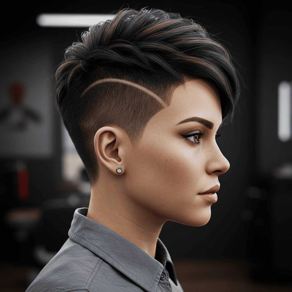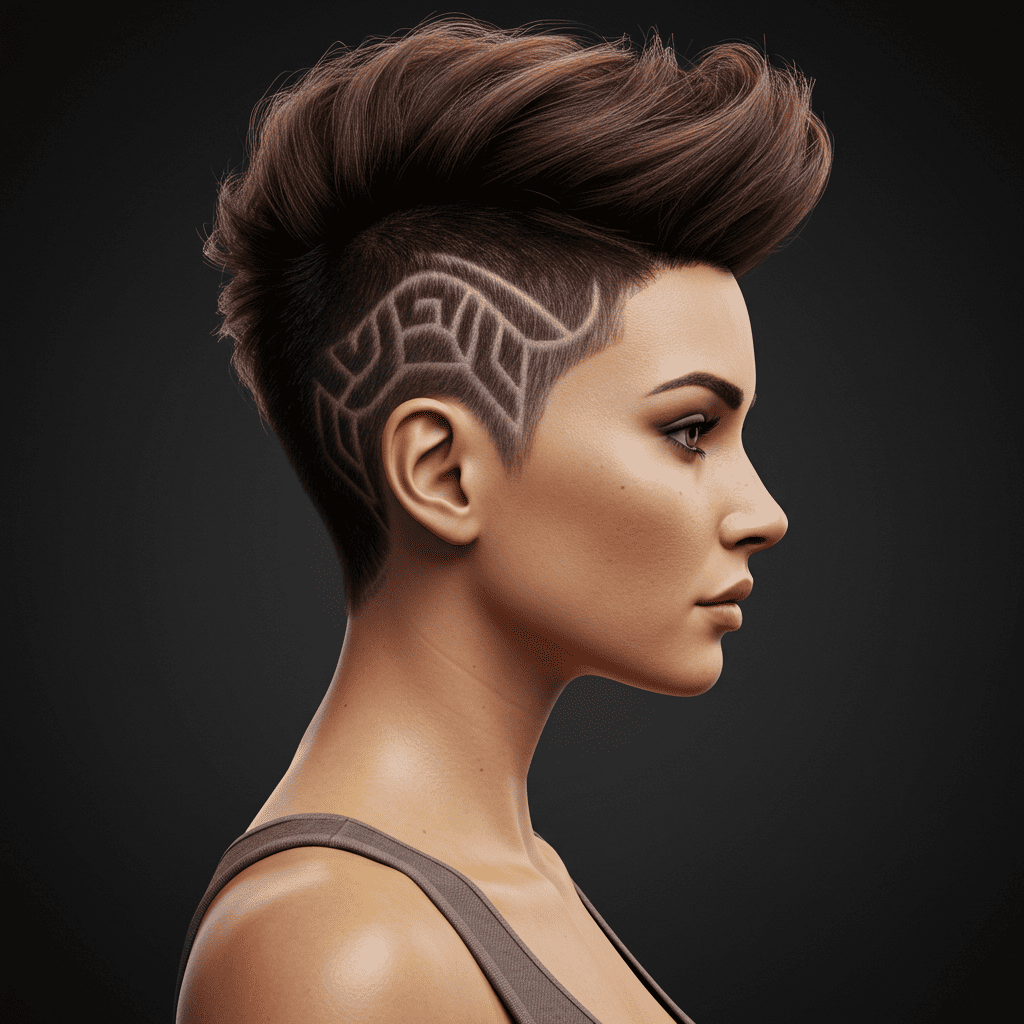 Creative undercut pixie featuring hidden geometric patterns revealed when hair is styled up. Perfect for those wanting versatility between professional and artistic expression.
