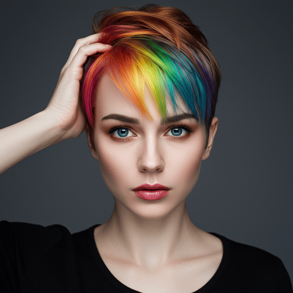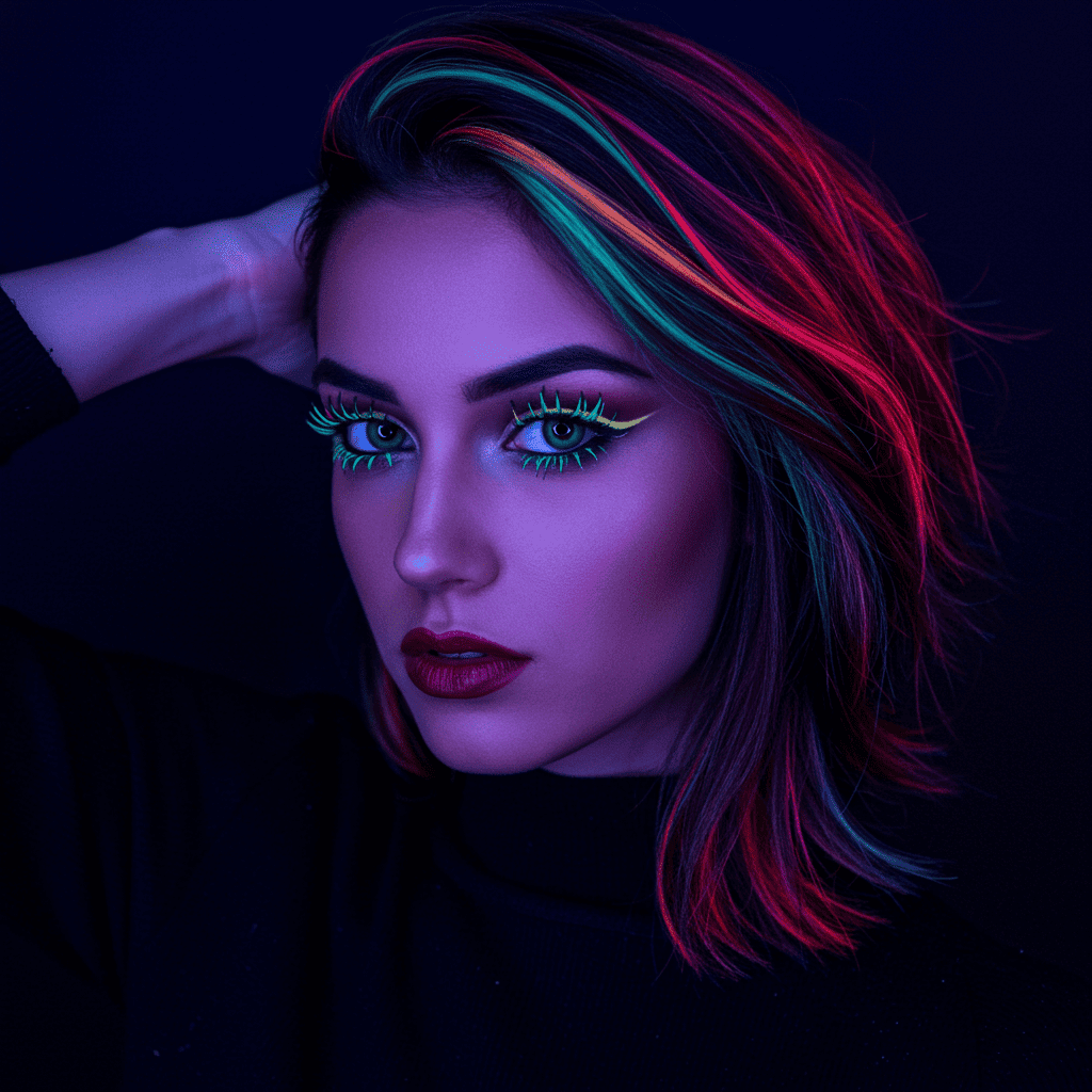 A bold pixie featuring strategic neon color highlights that pop against a darker base for maximum impact.