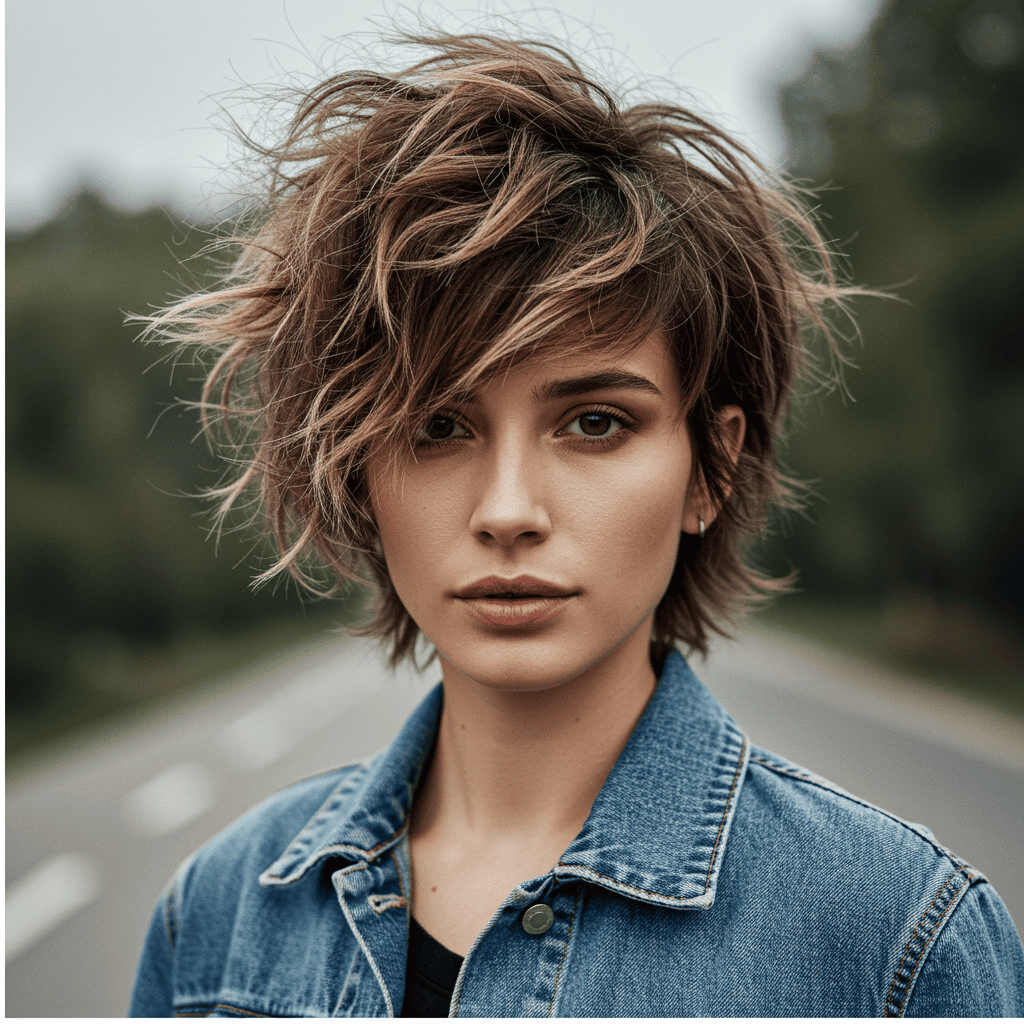 A relaxed, lived-in pixie with natural texture and sun-kissed color for effortless everyday style.