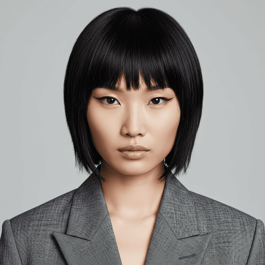 A pixie cut featuring statement-making blunt bangs that frame the face beautifully while keeping the sides and back short.