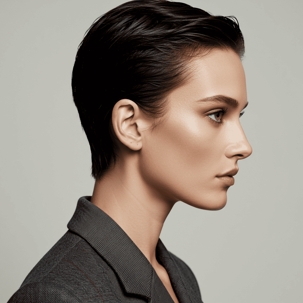 A sleek, wet-look pixie slicked completely back for a bold, high-fashion statement style.