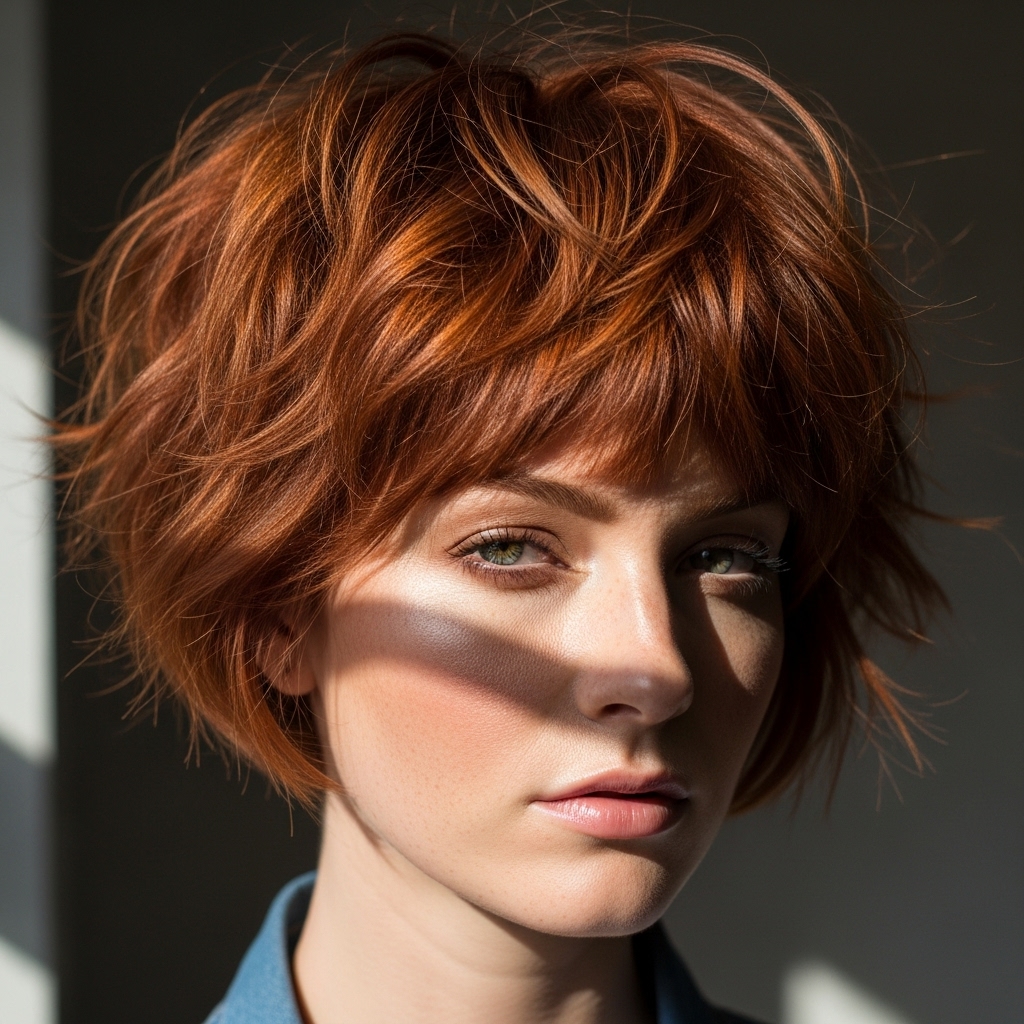 A heavily textured pixie cut in stunning copper tones, styled with deliberate messiness for that perfectly undone, effortless look.