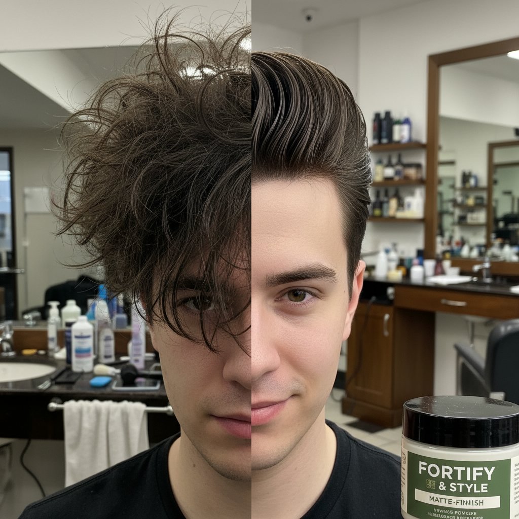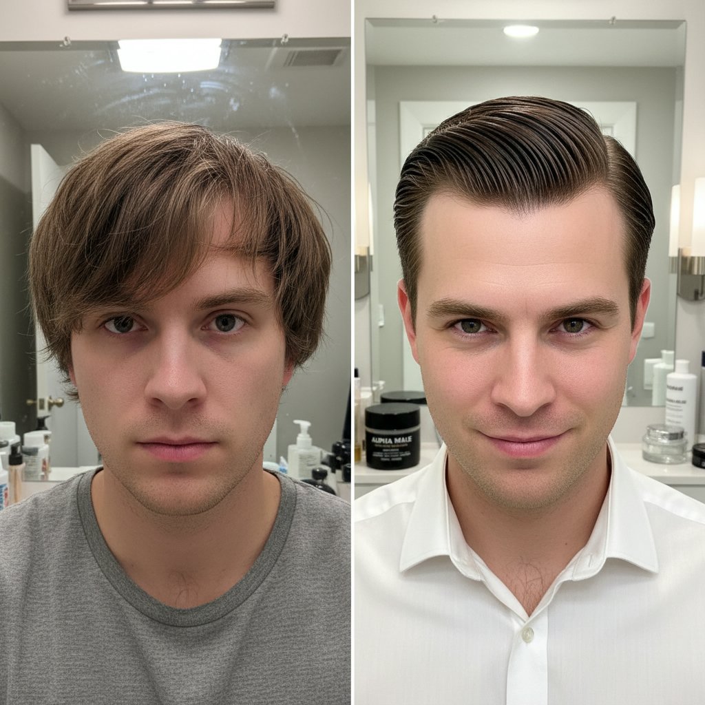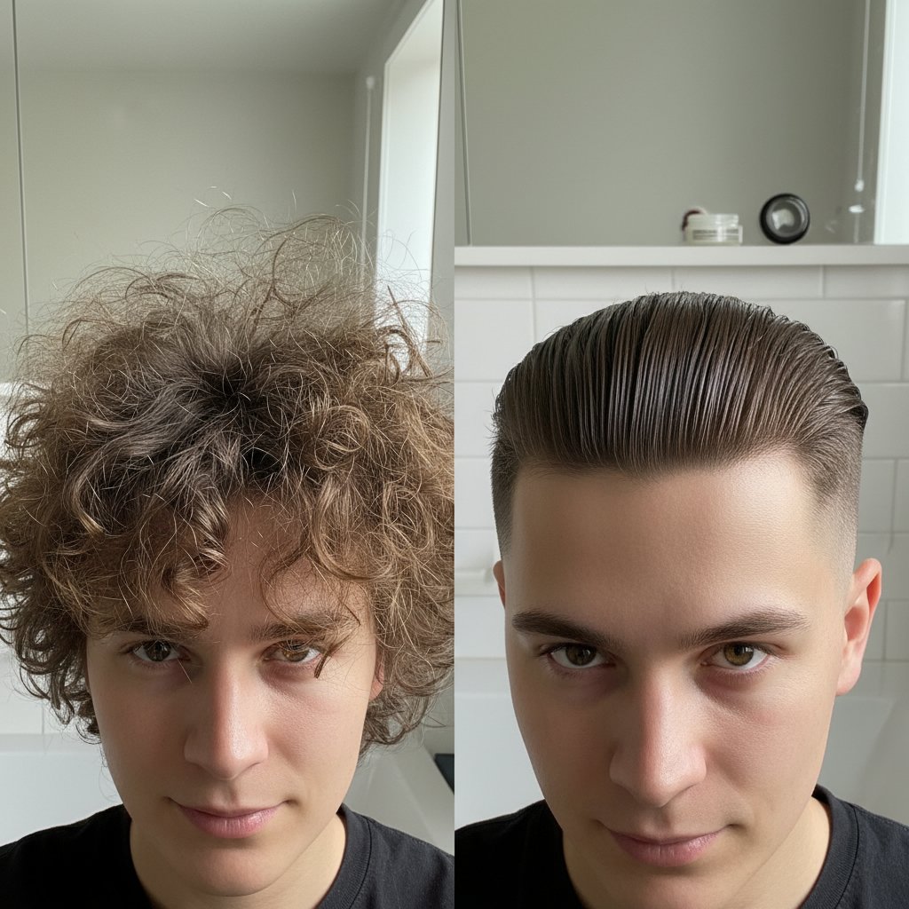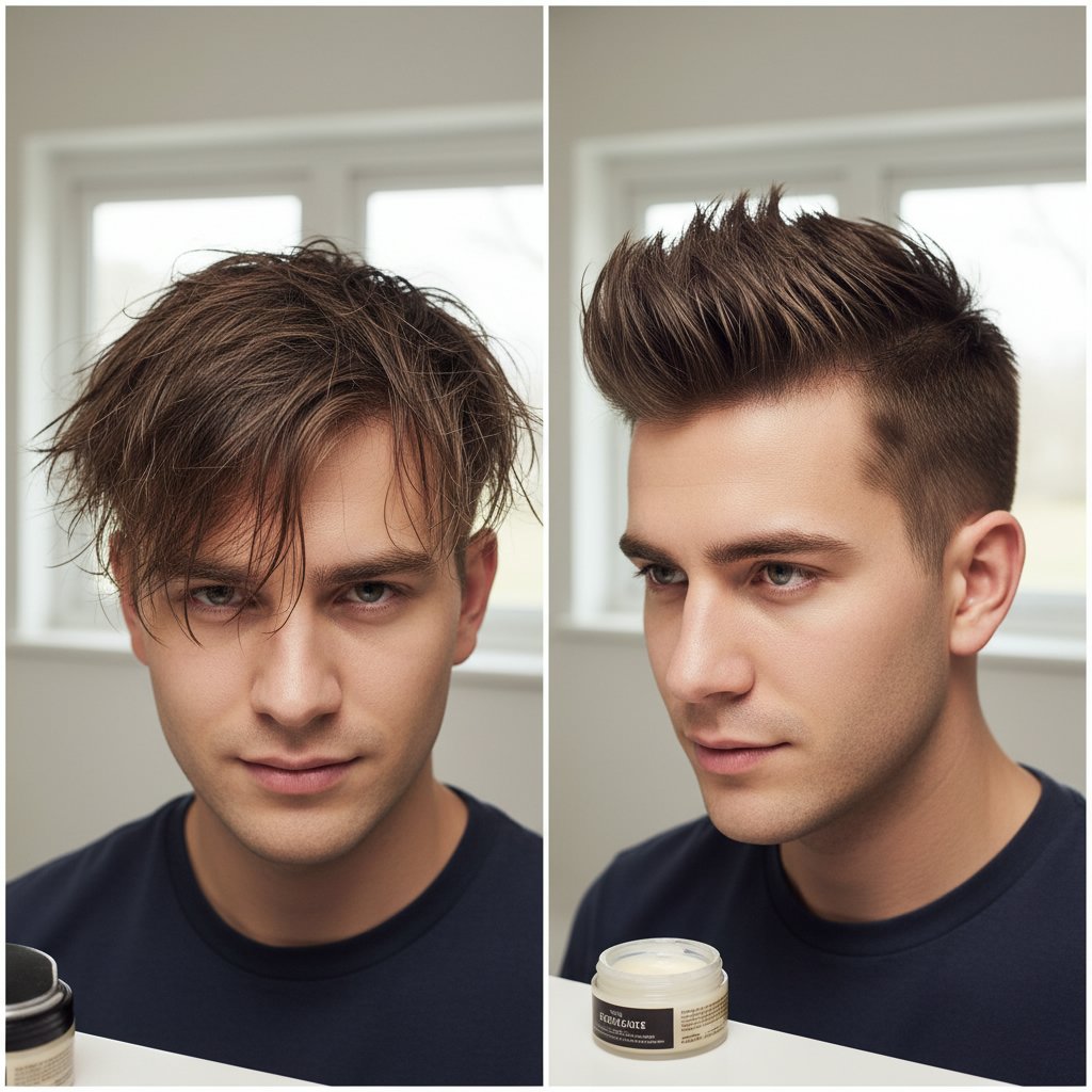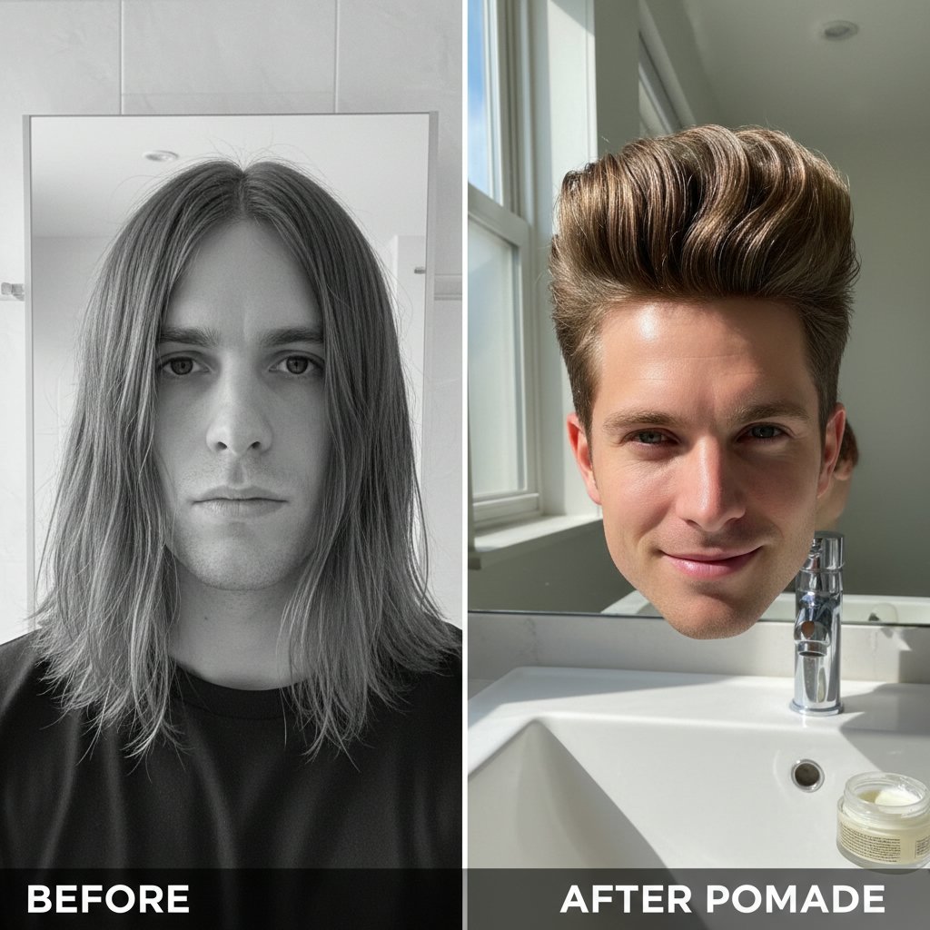 Before: Unruly, directionless hair. After: A sculpted, voluminous pompadour, exemplifying pomade's sculpting power.