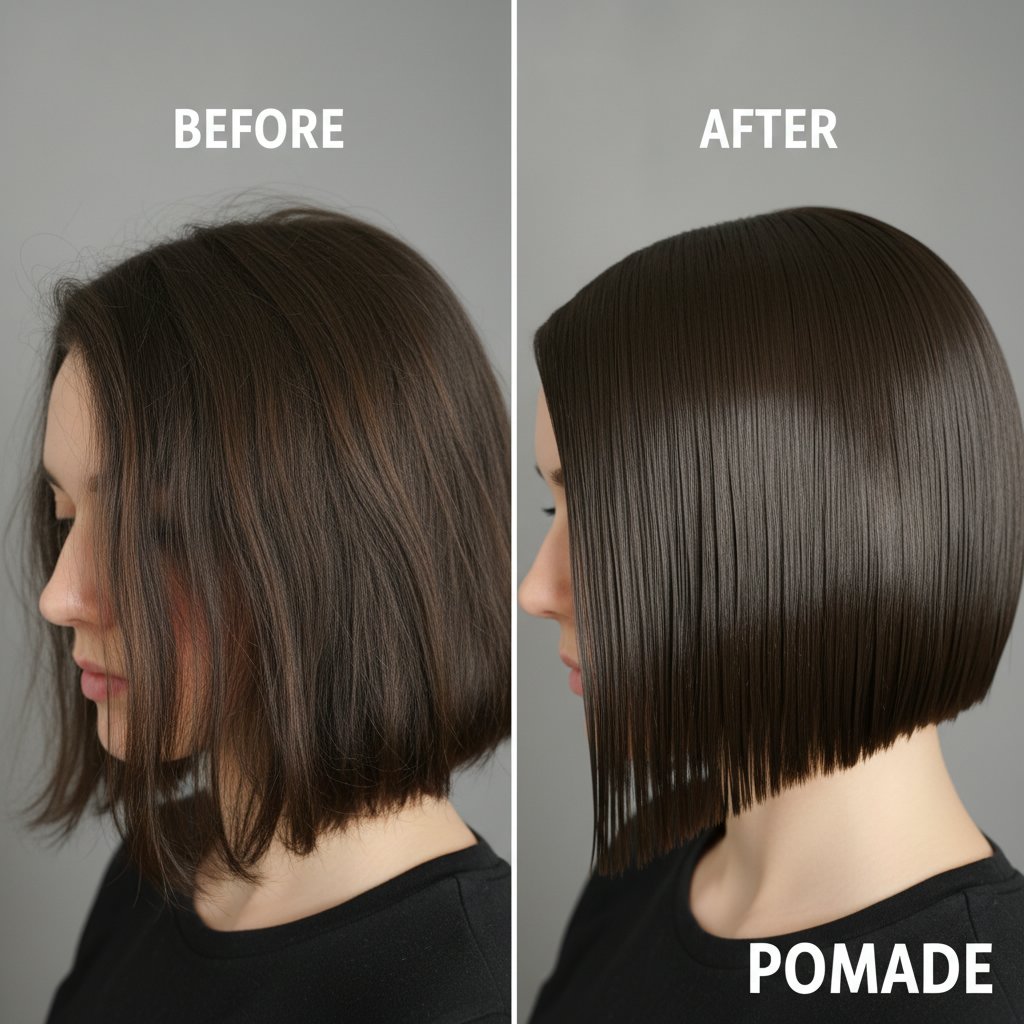 Before: Matte, unremarkable bob. After: A high-shine, sleek bob that turns heads, illustrating pomade's glossy effect.
