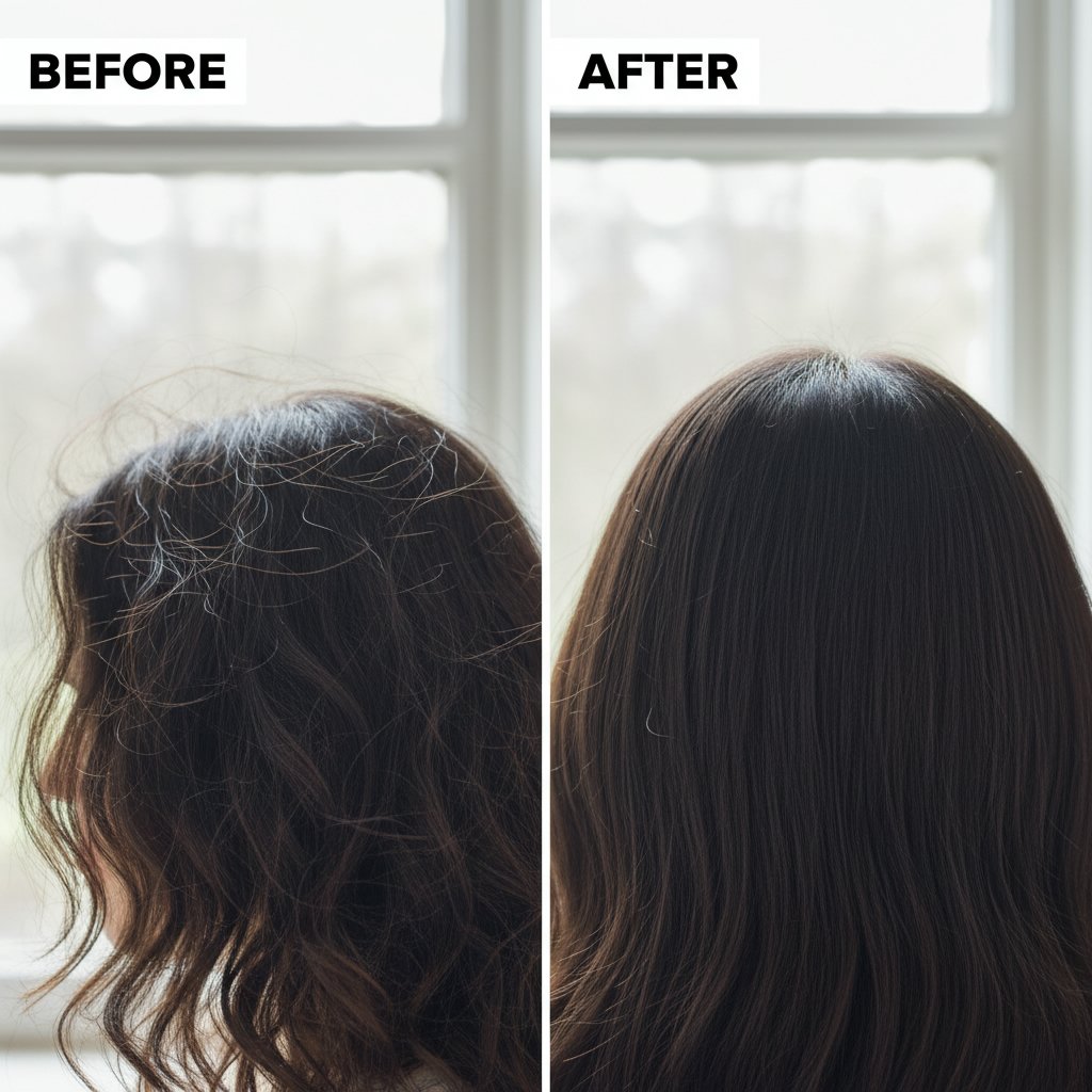 Before: Flyaways causing chaos. After: Sleek, cohesive style free of flyaways, thanks to pomade's smoothing capability.