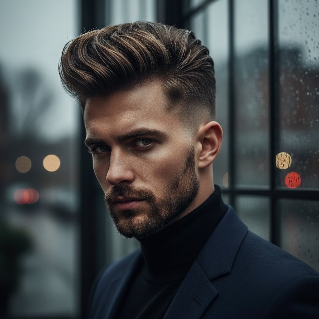 The brushed-back quiff, rich in texture, offers a laid-back yet sophisticated style, ideal for both casual and formal settings.