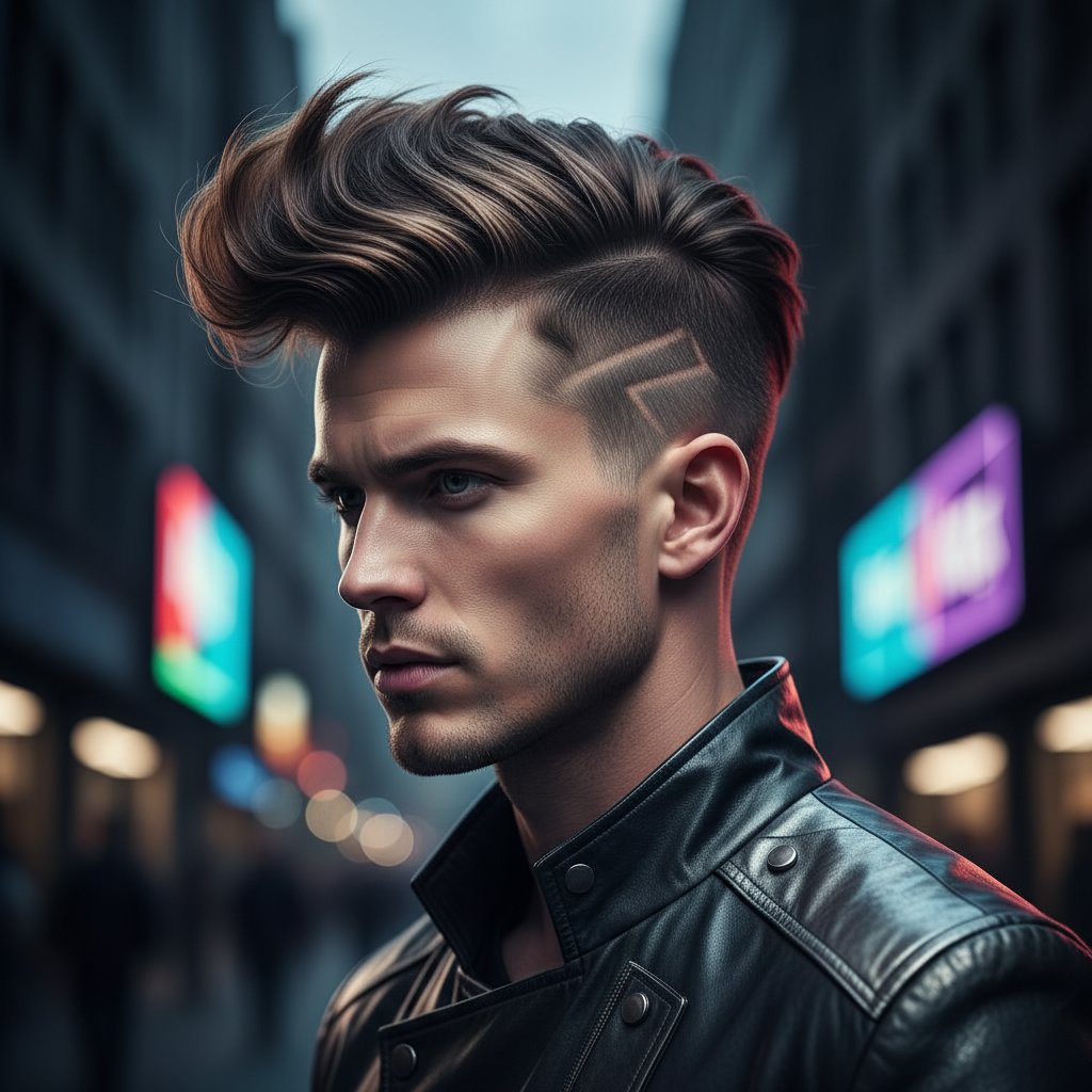 An asymmetrical quiff with a razor line introduces an edgy, avant-garde element to the classic pompadour silhouette.