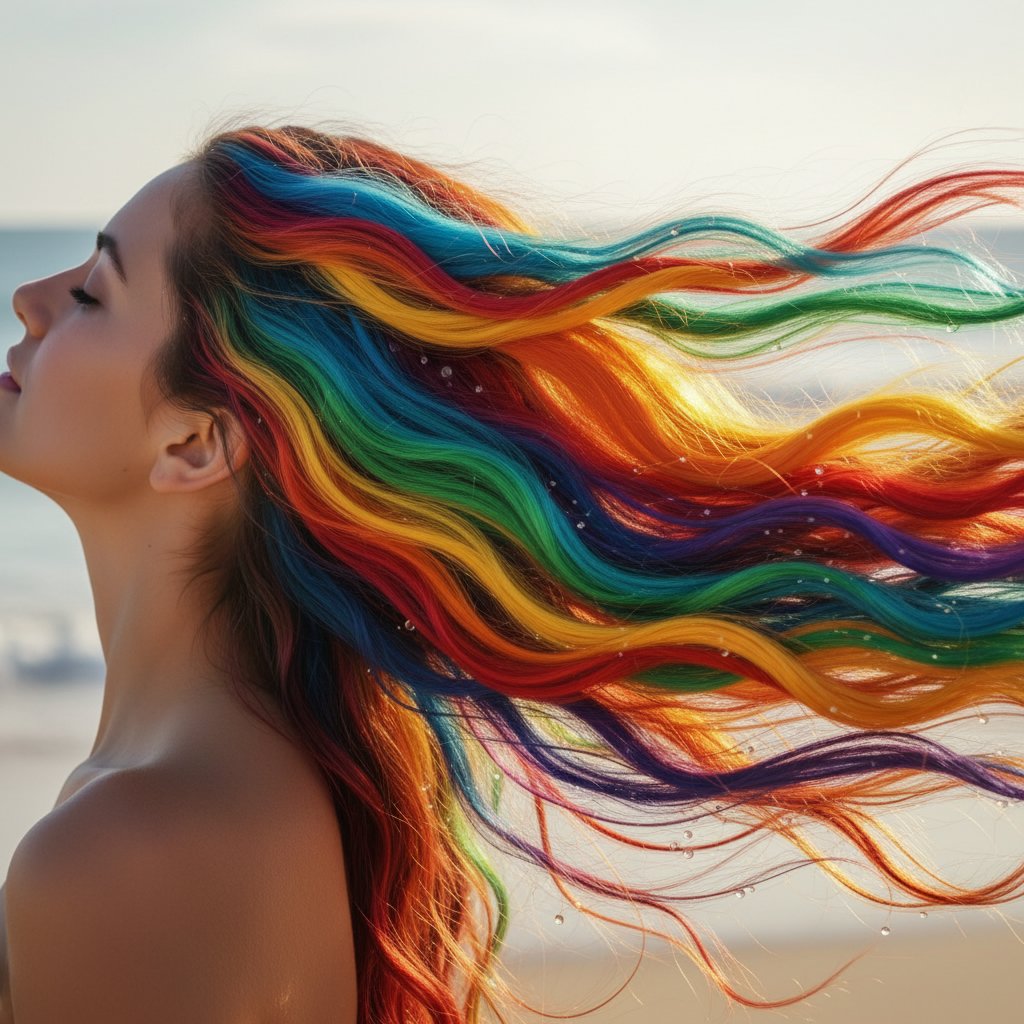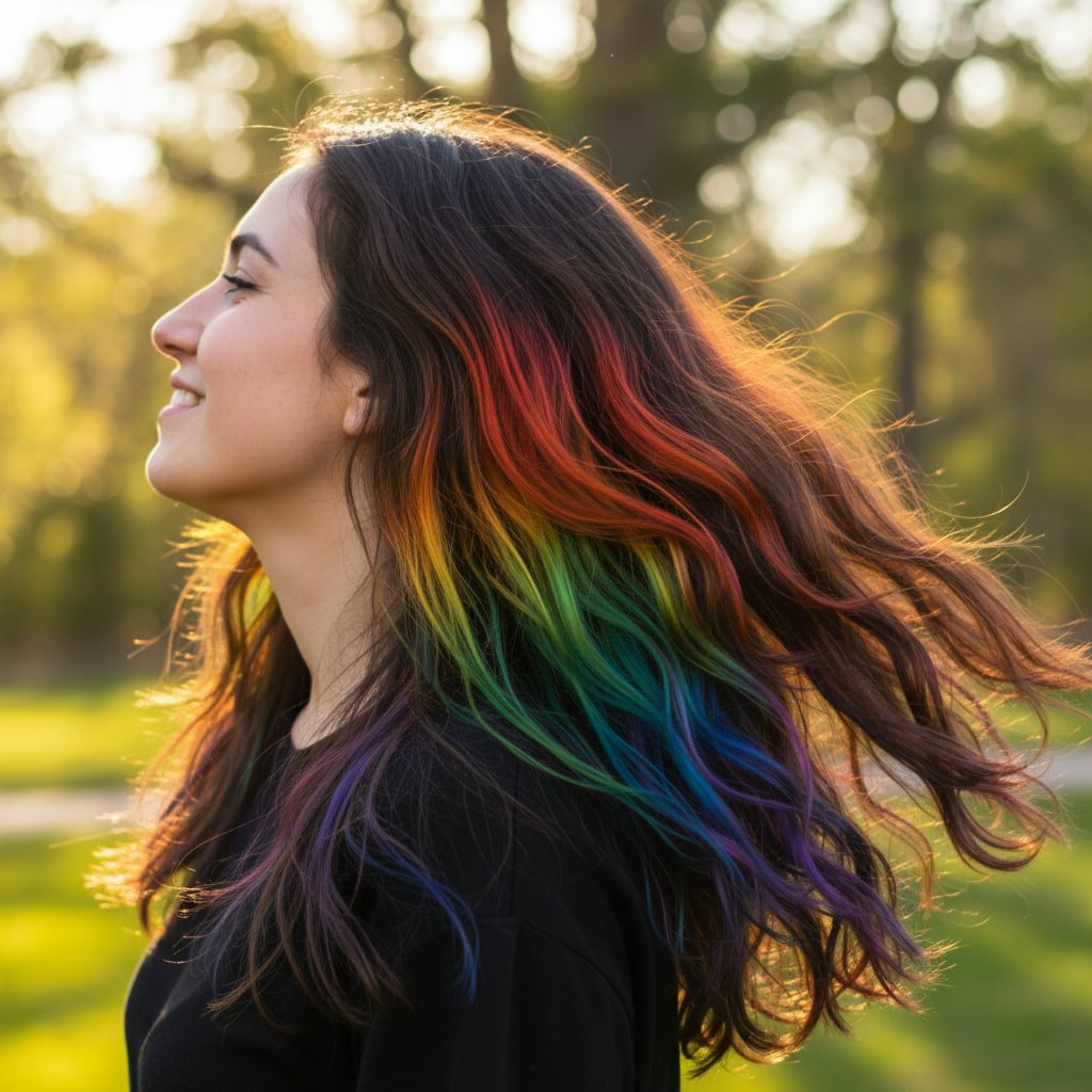 A subtle approach to rainbow hair, hidden layers reveal a secret spectrum of colors beneath the surface, visible only when the hair moves.