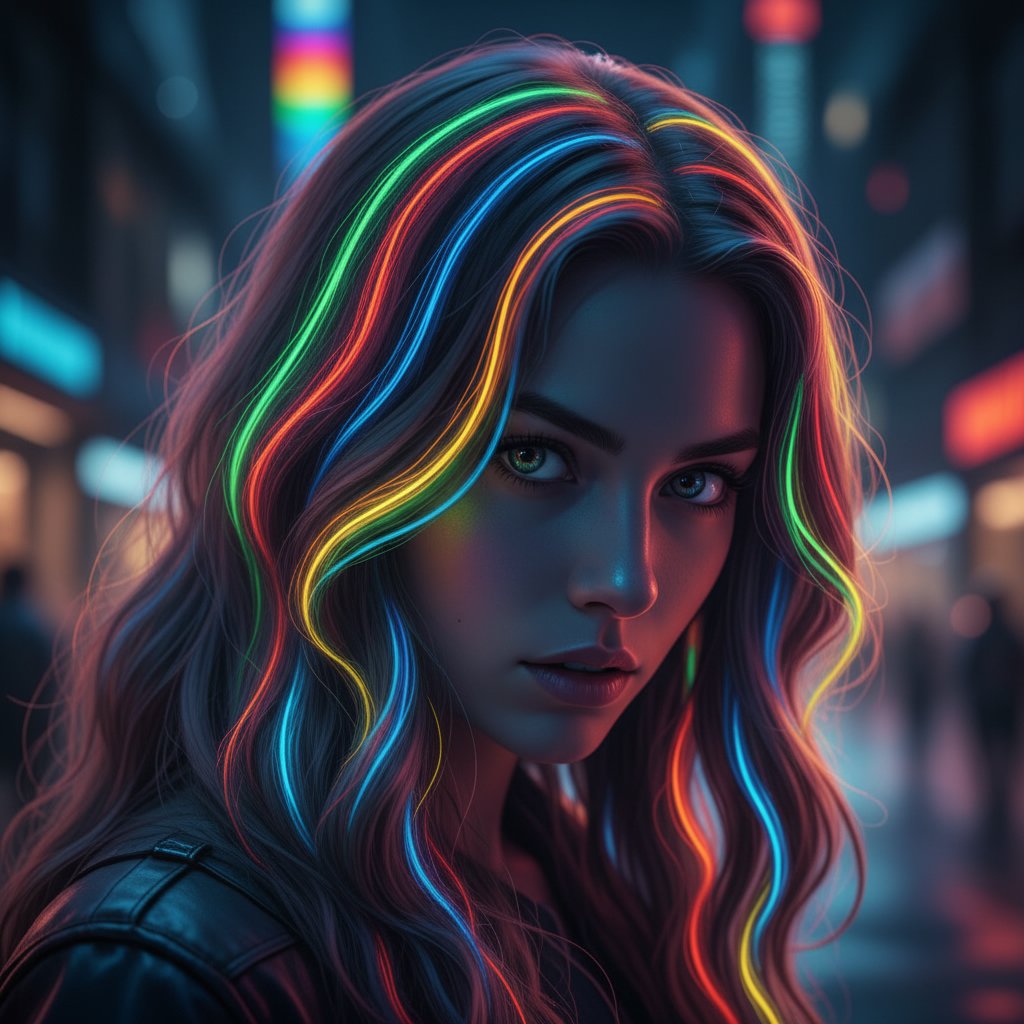 Neon rainbow streaks glow with intensity, adding a futuristic edge to the classic rainbow palette.