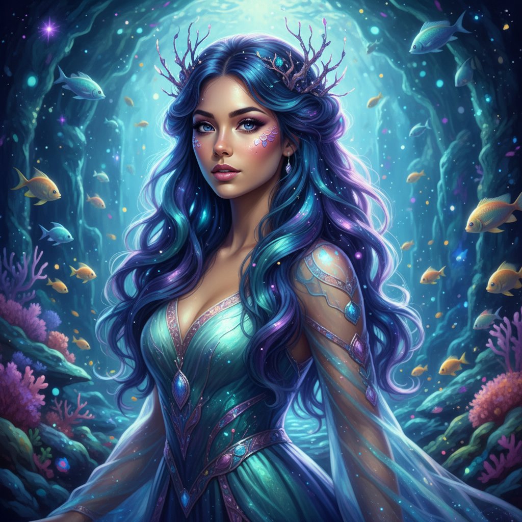 Deep, cosmic blues and purples merge with seafoam greens for a galactic mermaid effect, full of depth and mystery.