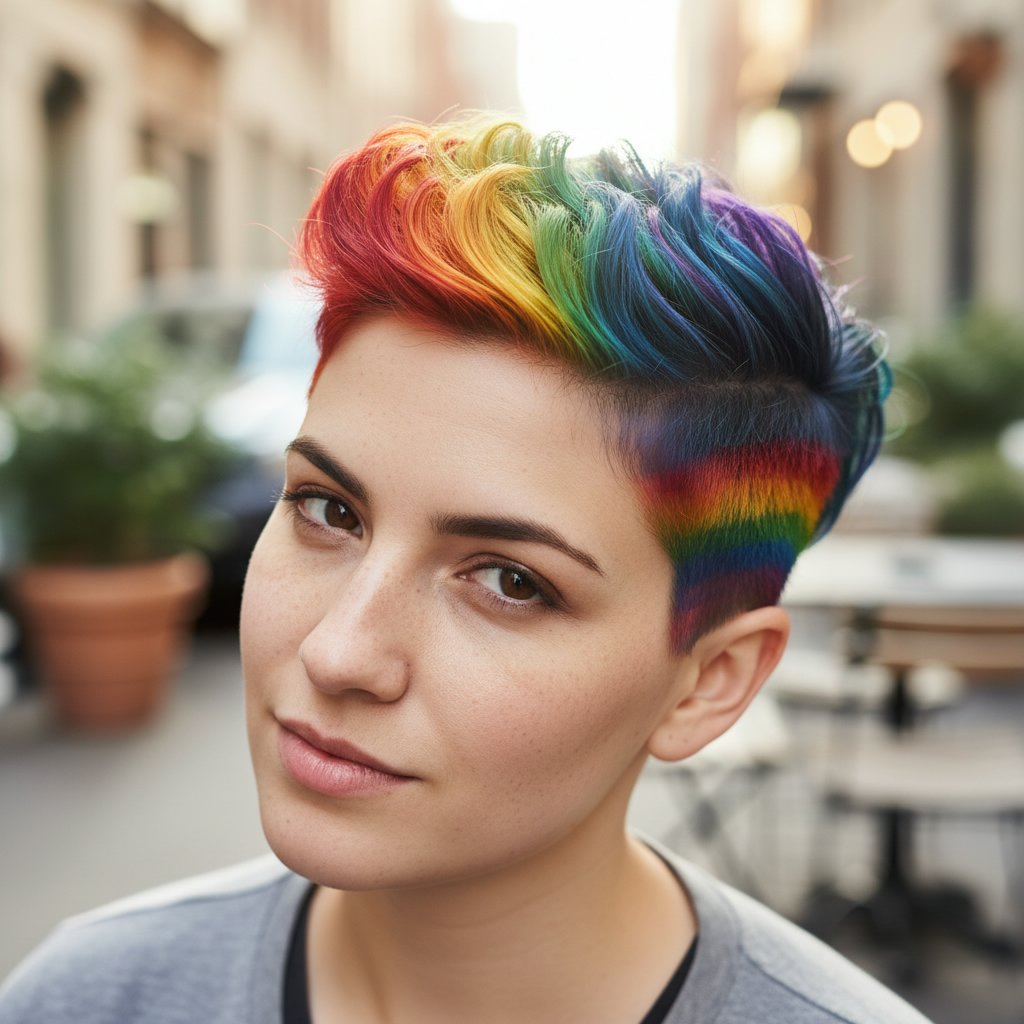 A bold rainbow undercut adds an element of surprise, with vivid colors peeking out from beneath a more subdued top layer.