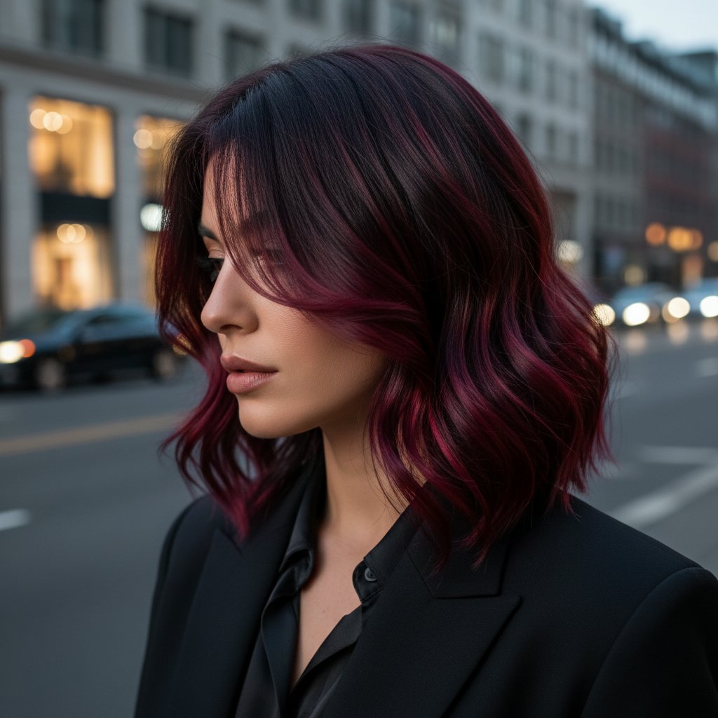 Ruby red highlights add a pop of color to darker hair, creating a stunning contrast that's both elegant and edgy.