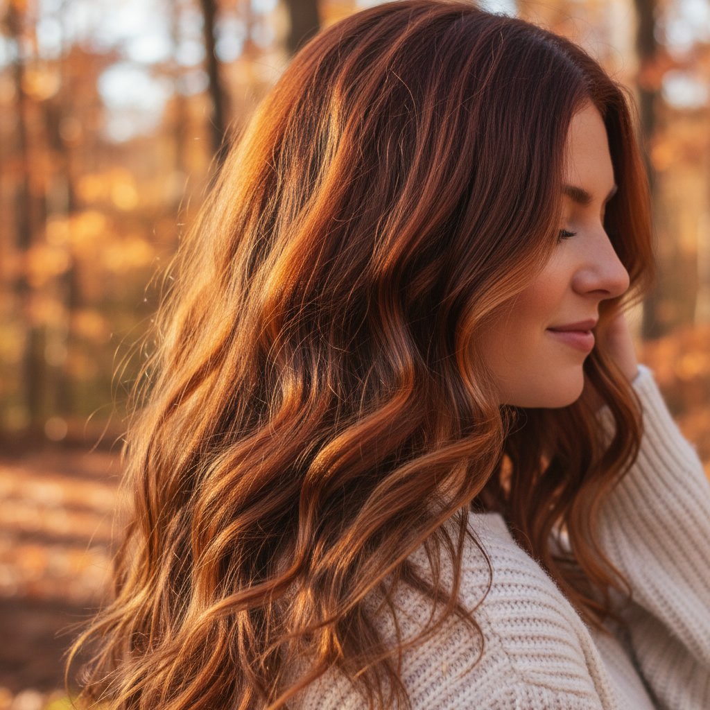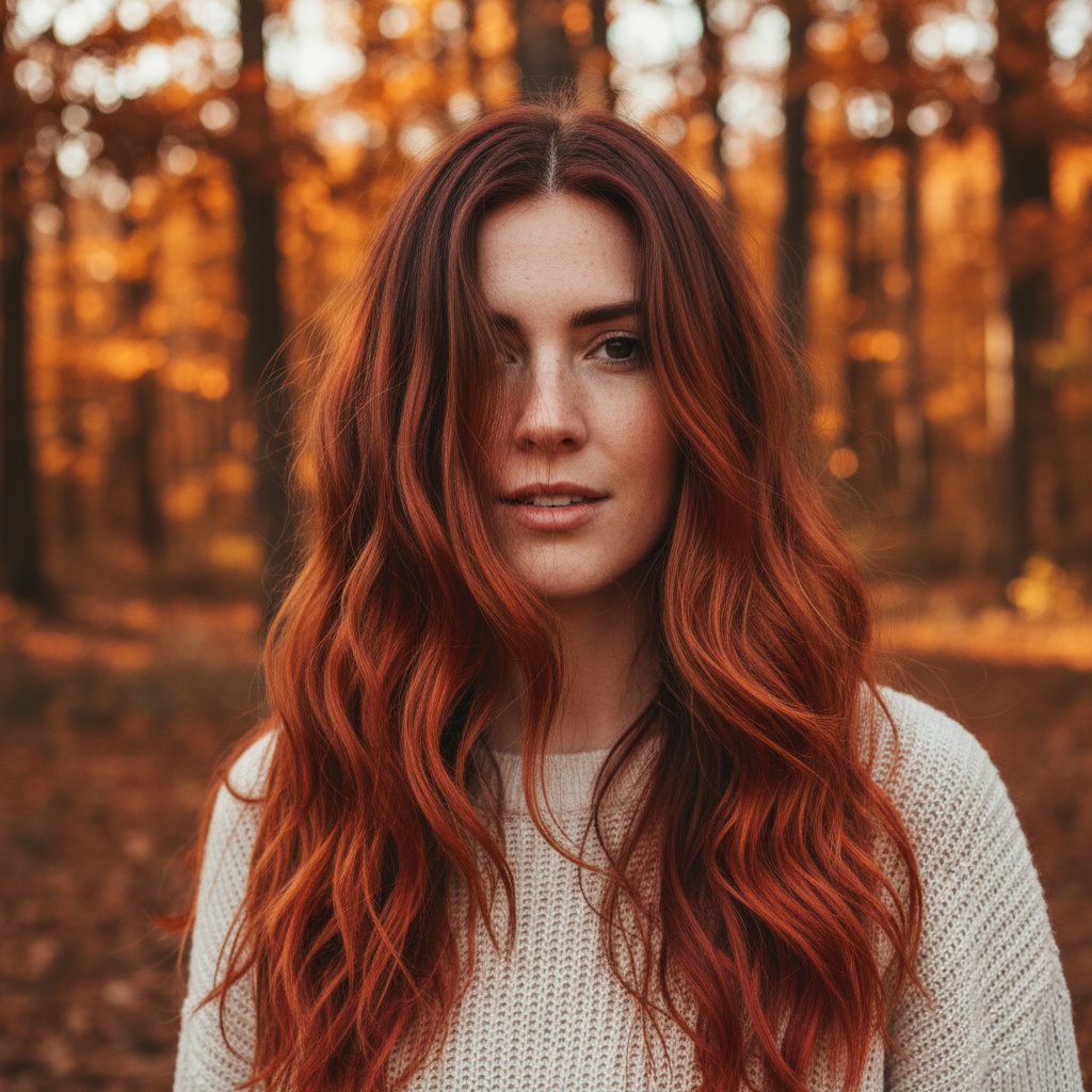 Copper hair shines with a metallic brilliance, radiating warmth and light for a striking, luminous effect.