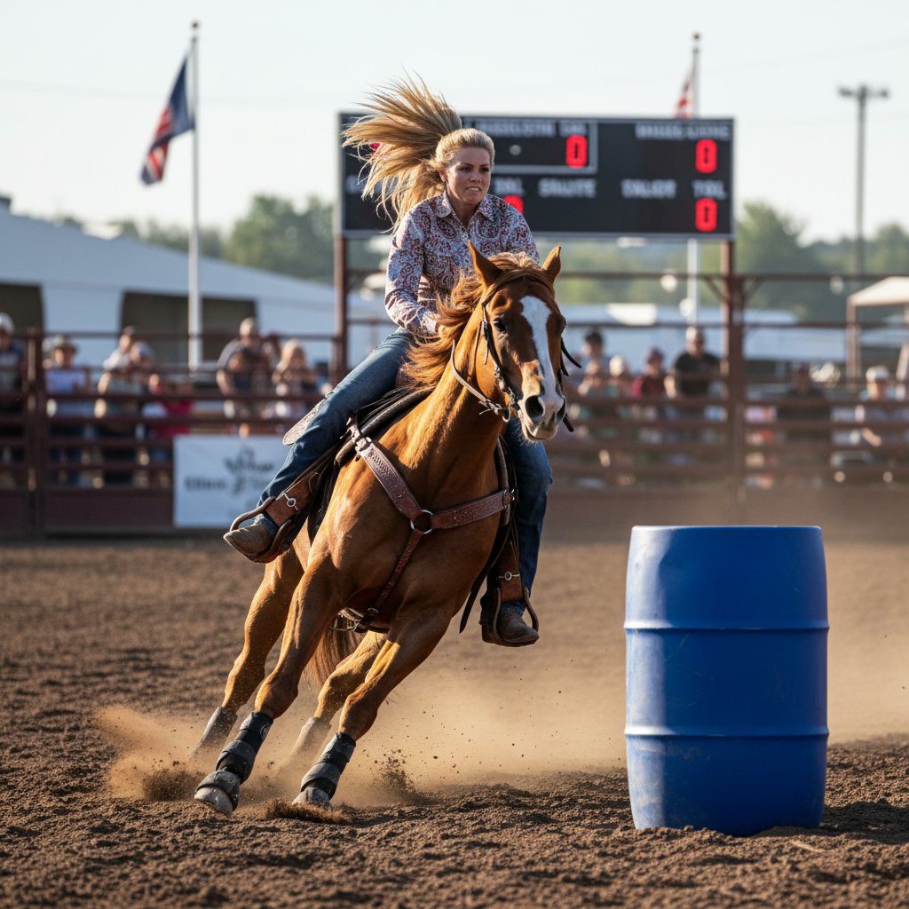 A high ponytail, swinging freely with every turn and gallop, captures the dynamic spirit of the barrel racer.