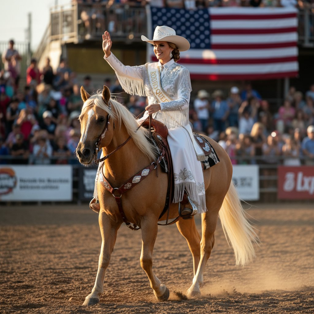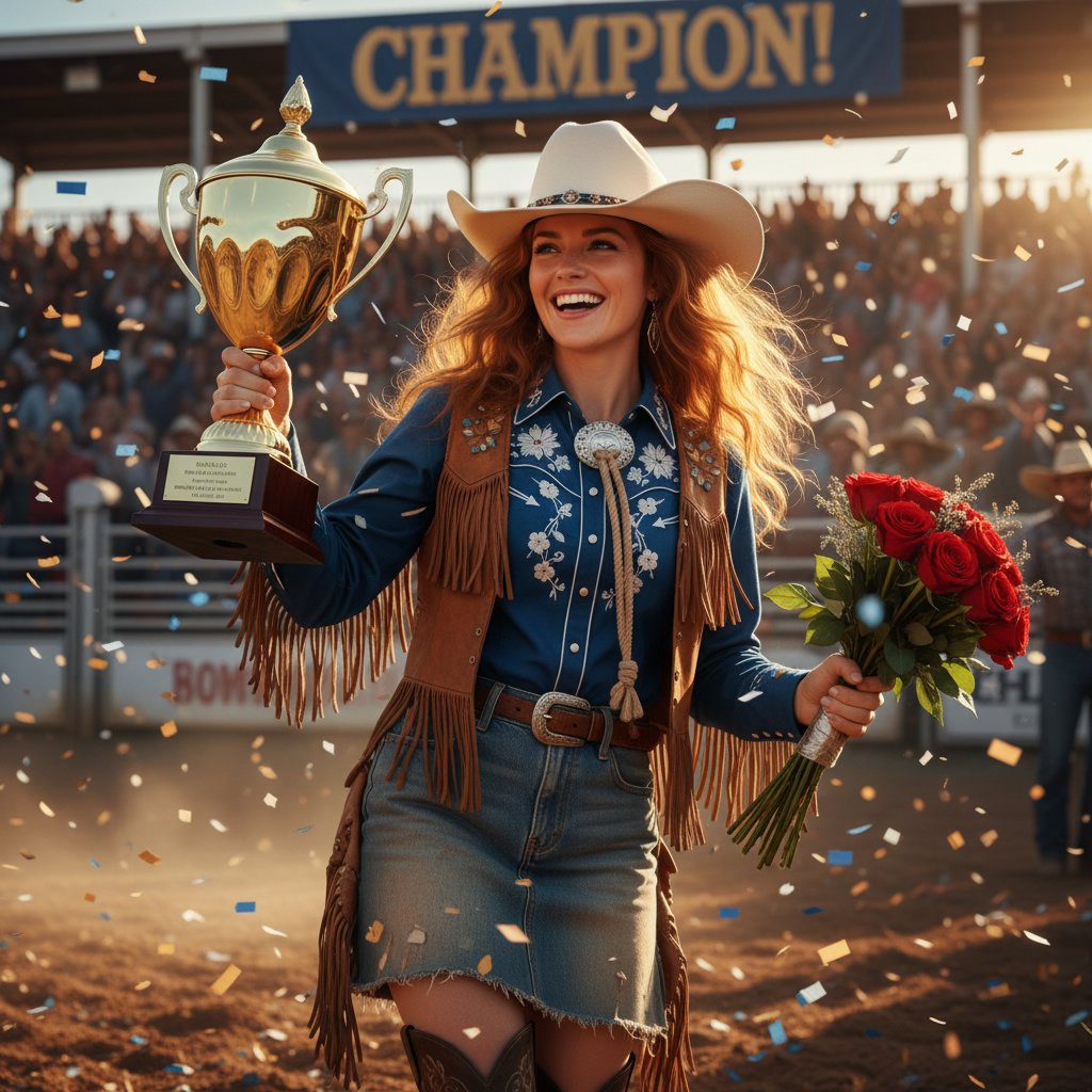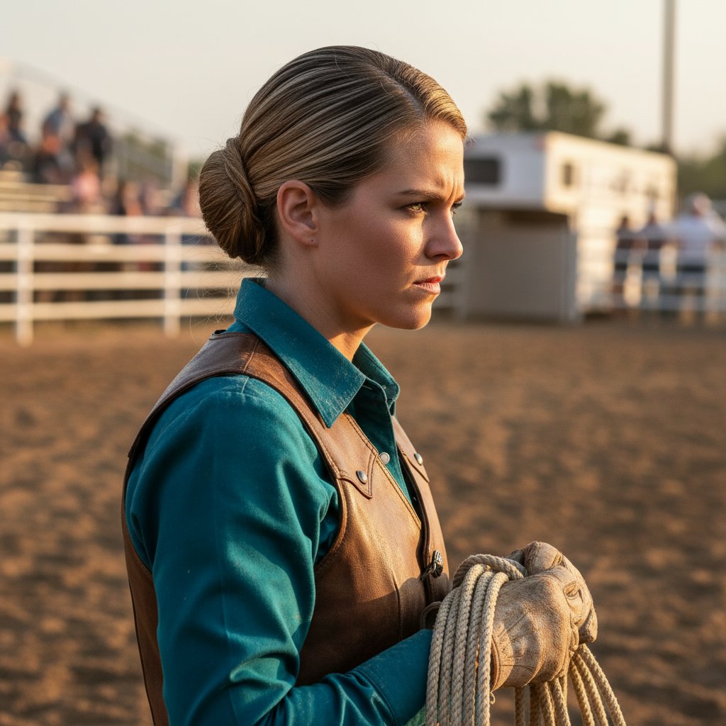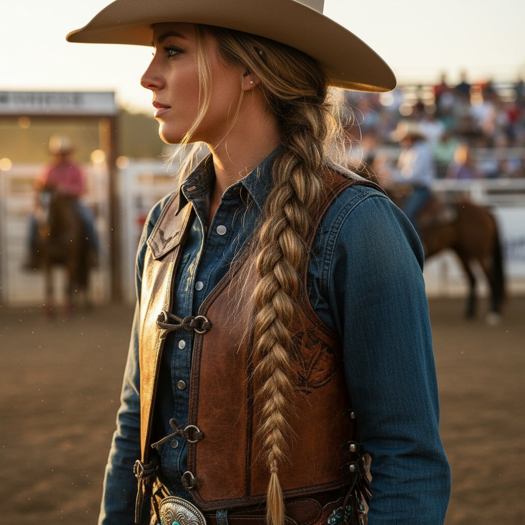 A long, tight braid ensures hair stays out of the way during intense competitions, embodying the practical beauty of the rodeo.